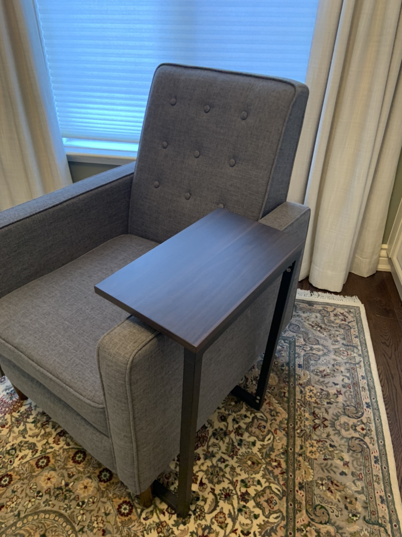 Reclining chair. Like new. Includes side table that can slip under the side or front. When reclined, you need about 1 foot behind the chair to recline.