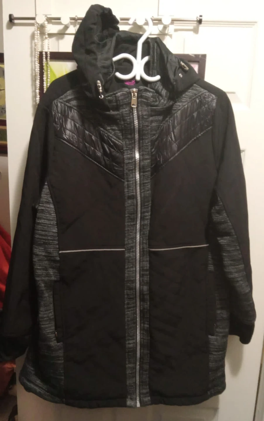 This is a women's black jacket with a quilted chest panel and contrasting grey heathered sleeves and side panels. It features a full zip closure and a hood. A practical outer layer for cooler weather!