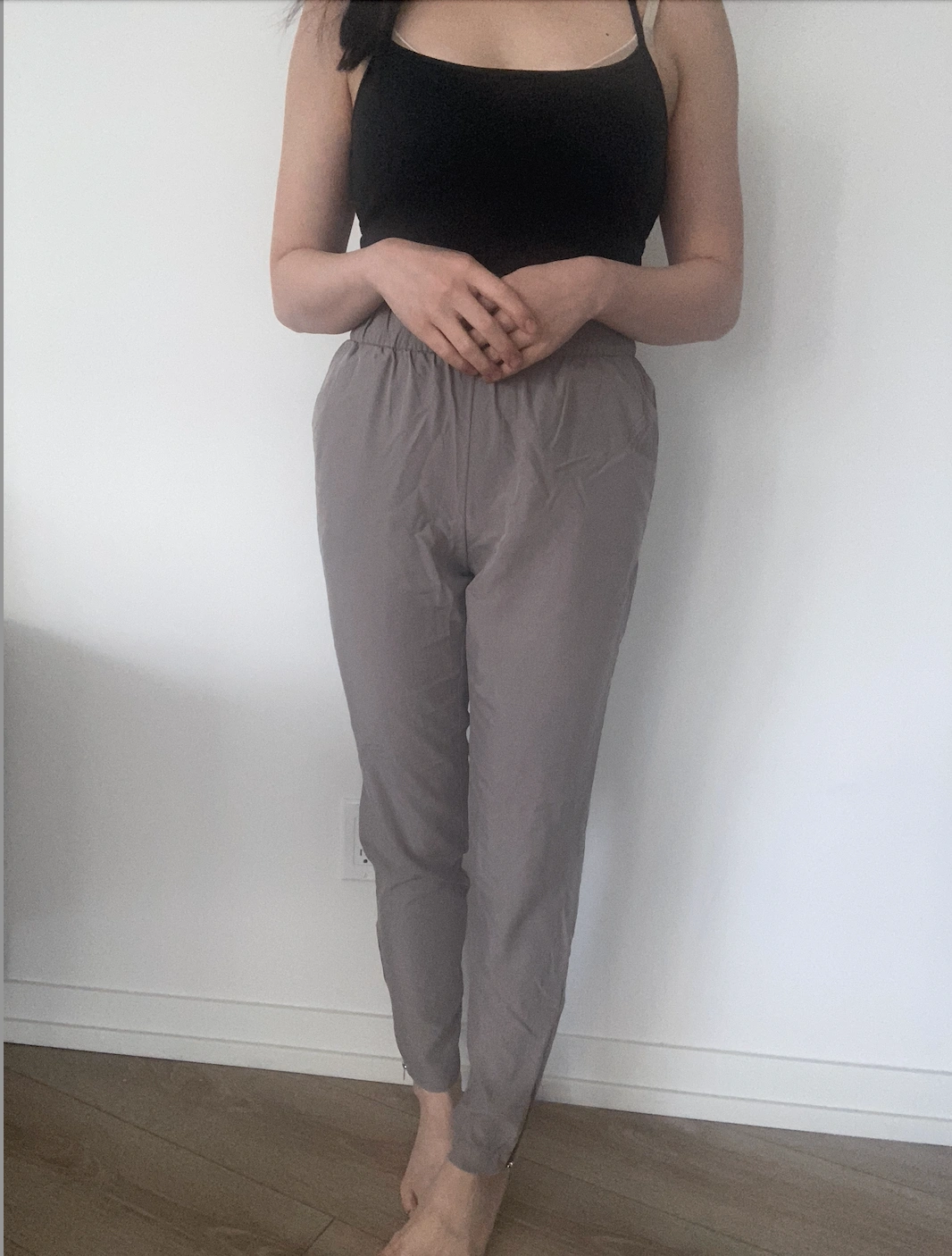 grey joggers with a zipper up the bottom the sides of the legs