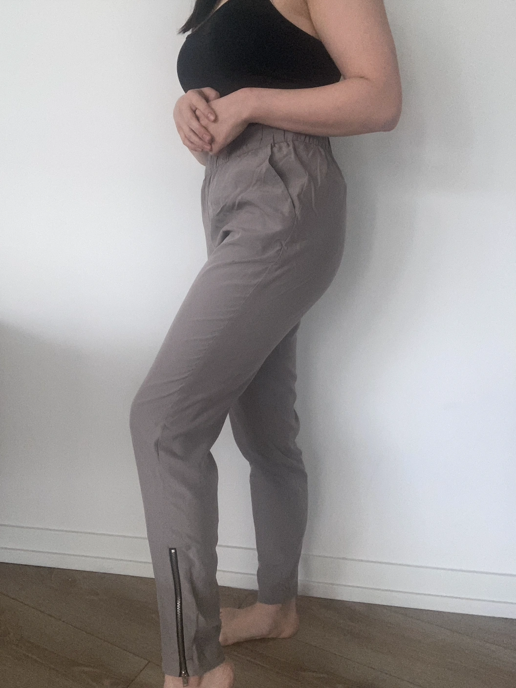 grey joggers with a zipper up the bottom the sides of the legs
