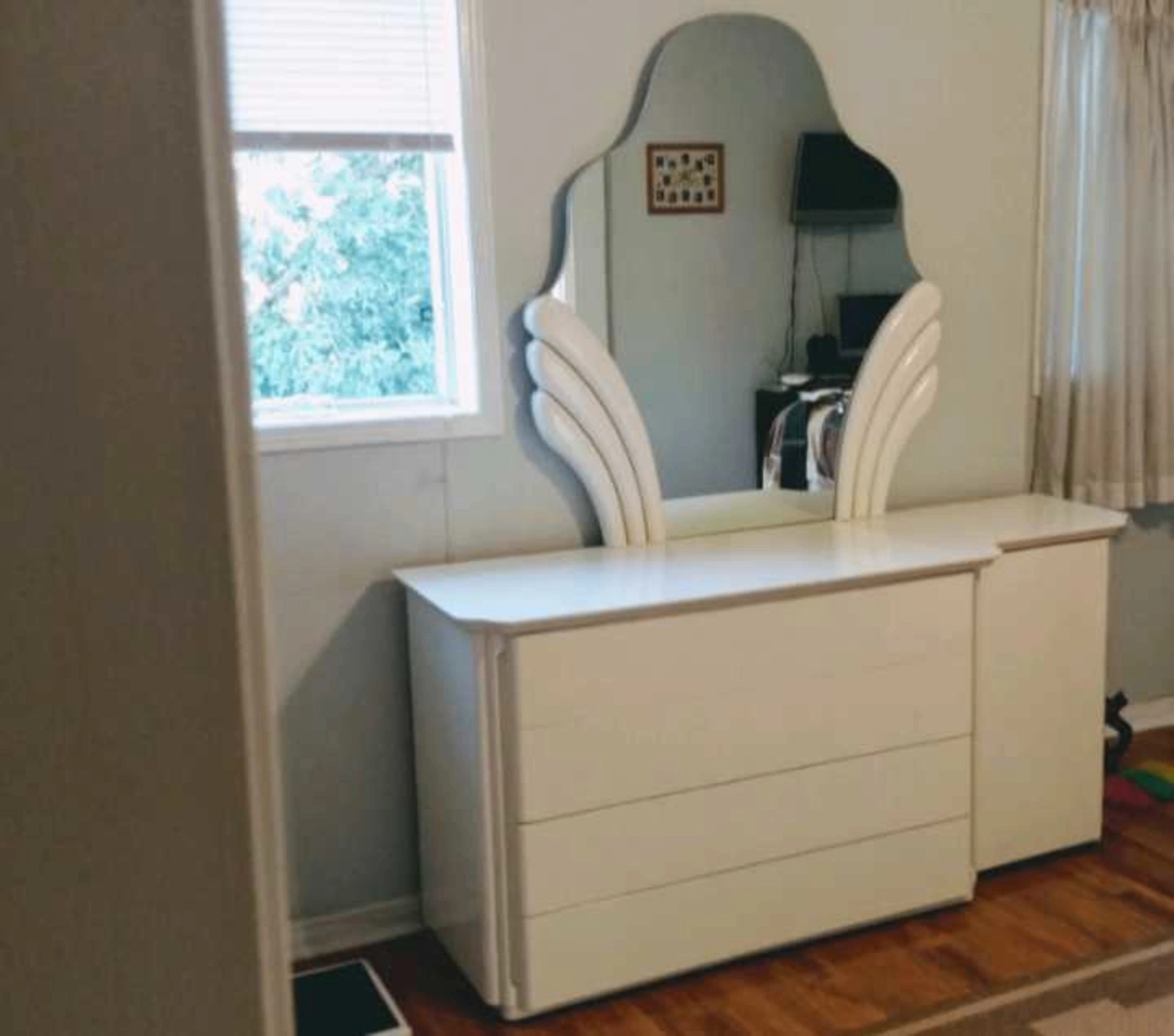 1 dresser with cupboard on right side and 4 long drawers on rollers with 1 Dresser mirror
