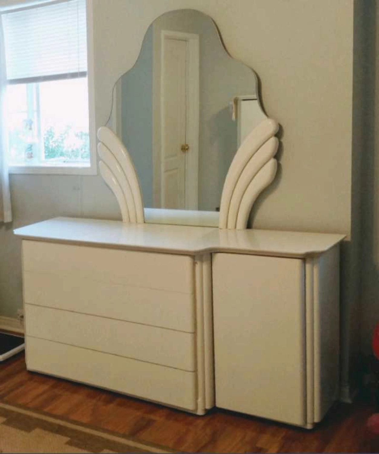 1 dresser with cupboard on right side and 4 long drawers on rollers with 1 Dresser mirror