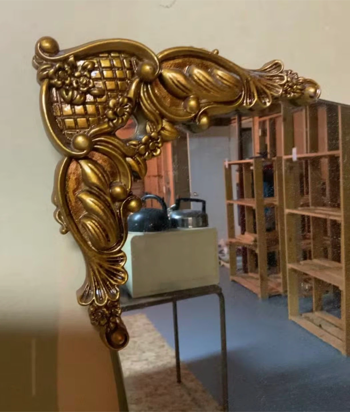 A beautiful decorative mirror with an ornate gold-coloured frame. The detailed scrollwork adds a touch of elegance. It's perfect for enhancing any room's decor.