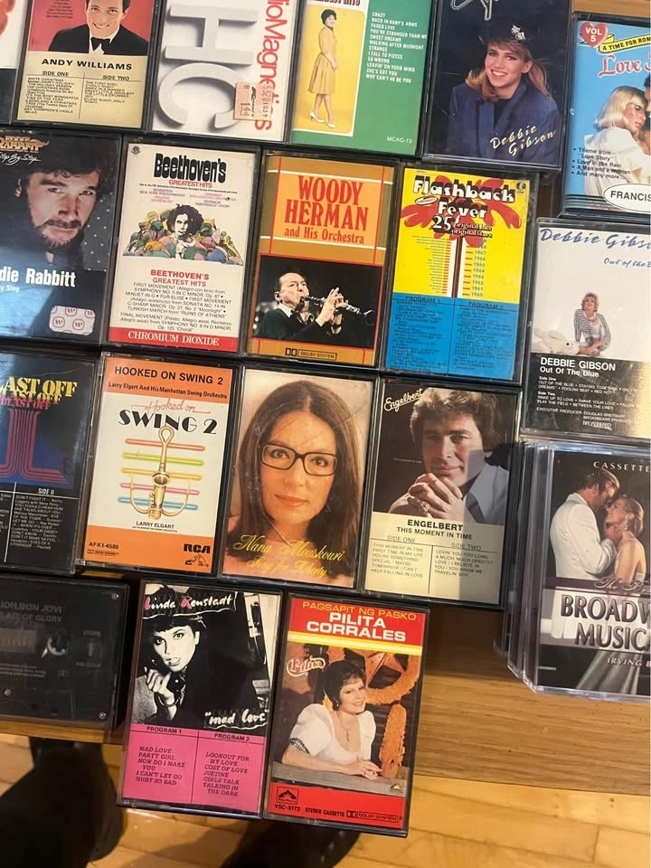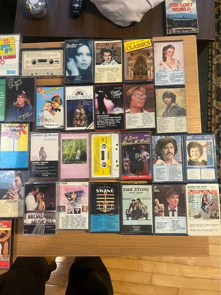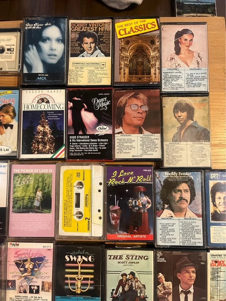 Assorted cassette collection from the 50s and newer, with about 50 tapes total. Includes artists like The Beatles, Tina Turner, Whitney Houston, Patsy Cline, John Denver, Frank Sinatra, and more. Please note that I haven't verified the contents or tested if all tapes work, so there might be a few duds. If there's anything specific you'd like me to check, feel free to ask!