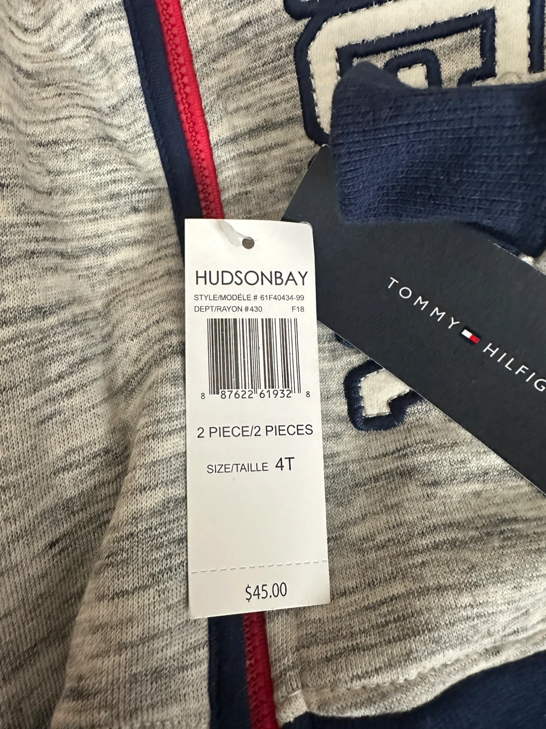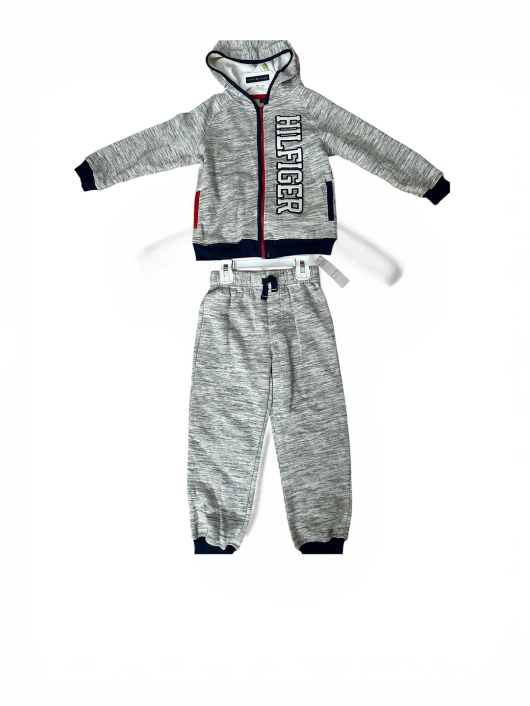 This is a two-piece Tommy Hilfiger tracksuit set. It's grey with navy blue trim and features the "Hilfiger" logo on the hoodie. Made of soft material for comfort. Perfect for active kids! 3T and 4T available brand new with tag