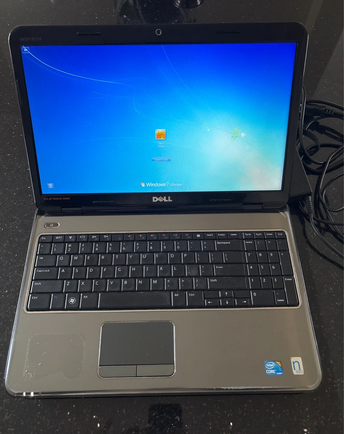 Dell Inspiron laptop running Windows 7 Ultimate. Features S/RS Premium Sound. Intel Core processor inside. Comes with power adapter. touchpad doesn't work/works perfect with mouse.