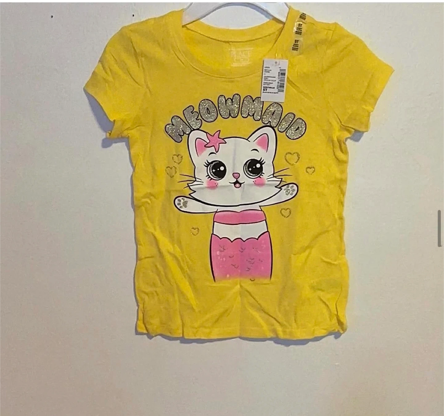 This bright yellow t-shirt from The Children's Place features a cute 'Meowmaid' graphic with a cat dressed as a mermaid. It's made from a soft, breathable fabric. Size 5T.