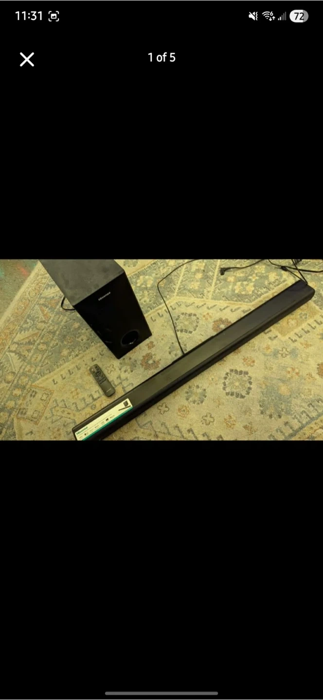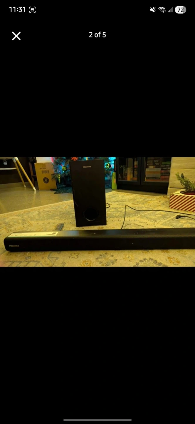 This Hisense 38-inch soundbar comes with a wireless subwoofer for thumping bass. It's a 2.1 channel system with Bluetooth connectivity. Includes remote and cables.
