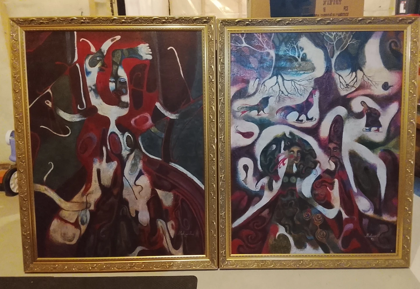 TWO ORIGINAL OIL PAINTINGS OF YHANA MOVCHAN FROM HER FIRST ABSTRACT SHE DID BEFORE SHE CHANCE IT WITH STILL LIFE WITH FLOWERS , BIRDS , AND PEOPLE . SHE A WELKNOWN ARTIST FROM UKRAINE MOVE IN CANADA . THIS TWO I BOUGHT FROM SHEARWAY GARDEN ART GALLERY IN 1990 'S PM ME I CAN TRADE WITH COINS . , OLD SPORTS CARDS ZISE OF THIS PAINT IS 34 inch WIDEX 48 inch HIGHT .PM ME ANYTIME . READY TO HUNG.