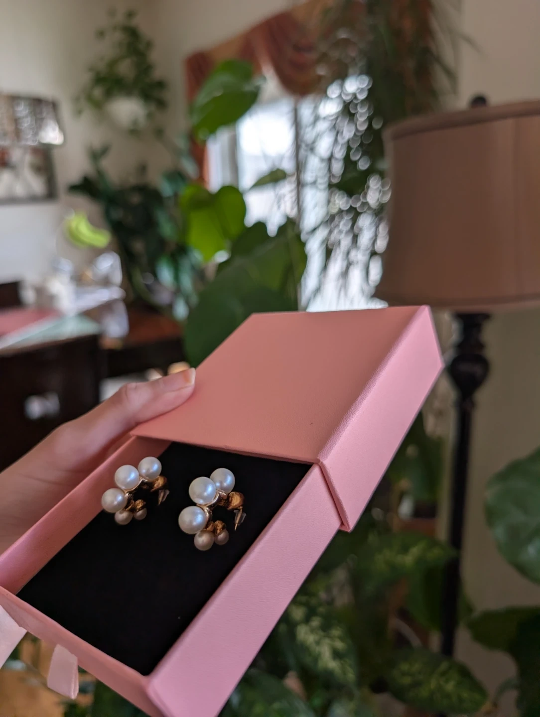 These are pretty pearl cluster earrings. They're gold-toned with faux pearls. They come in a nice pink gift box. These earrings add a touch of elegance!