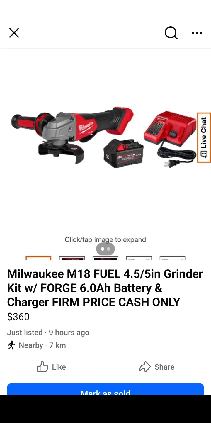 This is a Milwaukee M18 FUEL 18V cordless brushless grinder kit. It includes a 4.5/5in grinder, a FORGE 6.0Ah battery, and a charger. It's designed for extended power and faster cutting. FIRM PRICE CASH ONLY