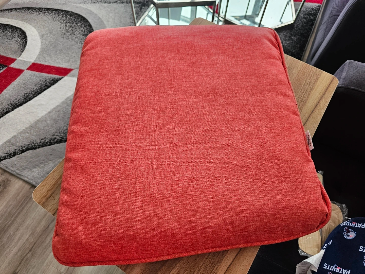 Selling a Canvas seat cushion in carrot red color . It's in great condition and ready to add a pop of colour to your space!