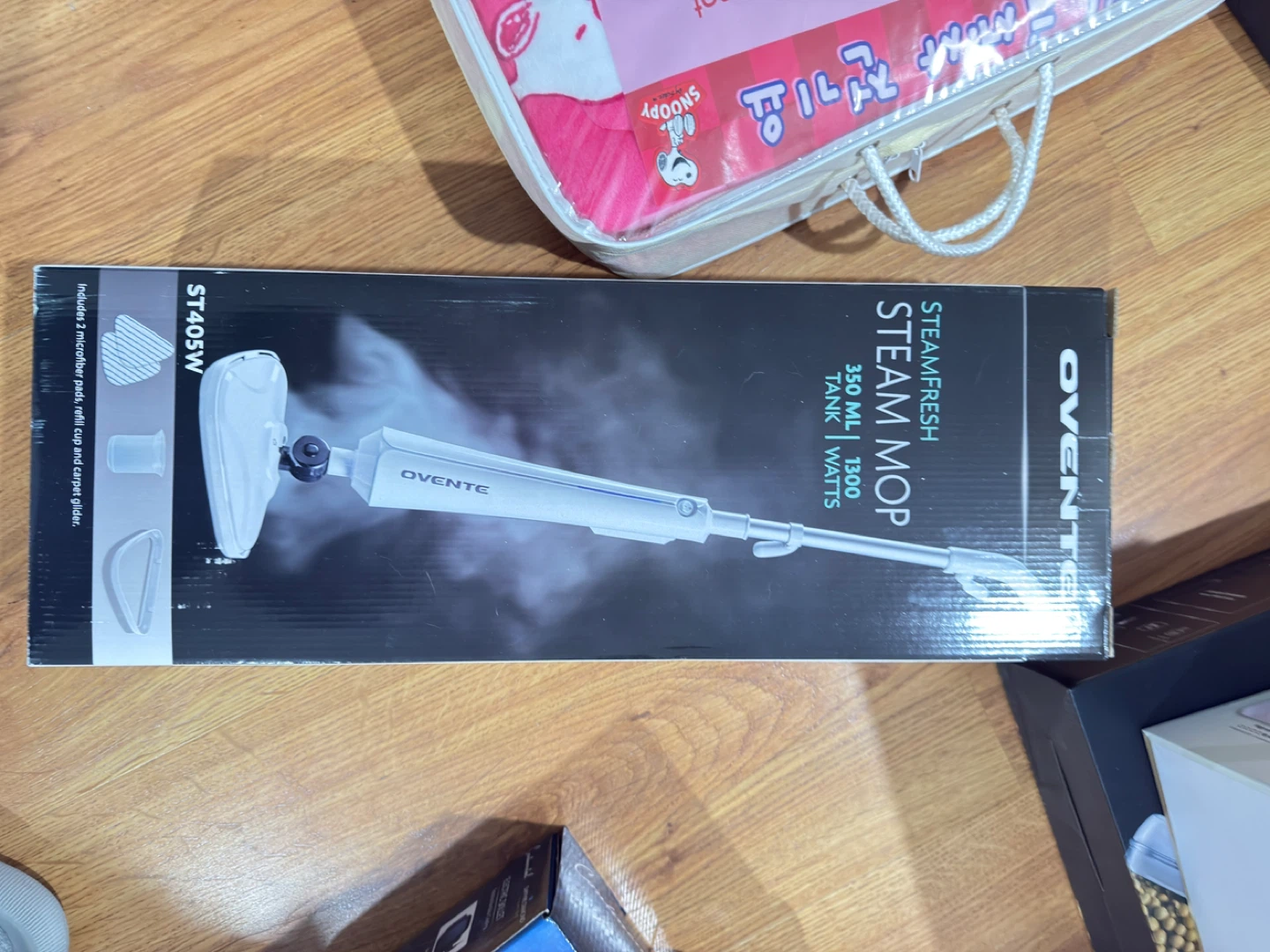 Selling an Ovente Steamfresh Steam Mop, model ST405W. It features a 350 mL tank and 1300 watts of power. The box includes 2 microfiber pads, a refill cup, and a carpet glider