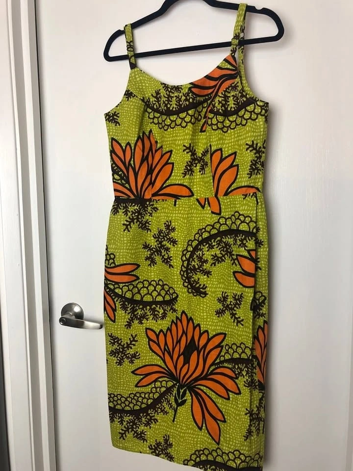 Zipper closure. Flat garment measurements (approximately): Pit to pit: 16.5", Waist: 14", Hip: 17", Length: 33.5". Machine wash with similar colors. Hang to dry. Locally and ethically made by my mum. Pick up in River District.