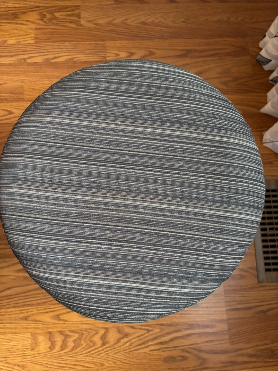 Selling a cute upholstered stool with a striped pattern! It's in great shape and would be perfect as an accent piece or extra seating. The material is a blend of polyester fibres and polyurethane foam.