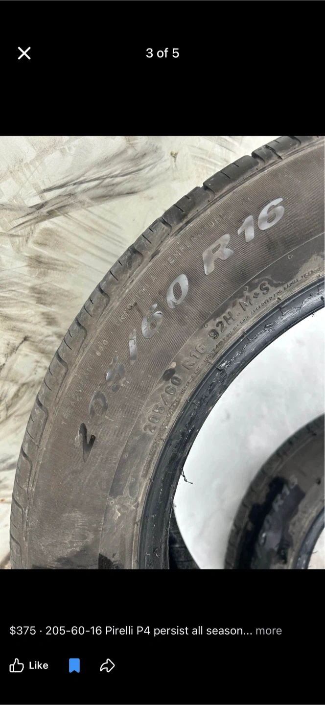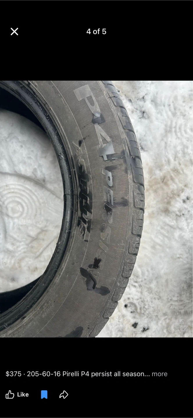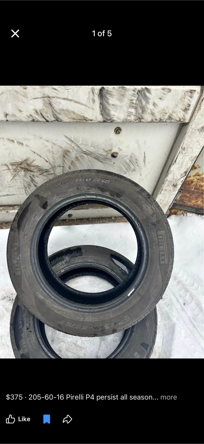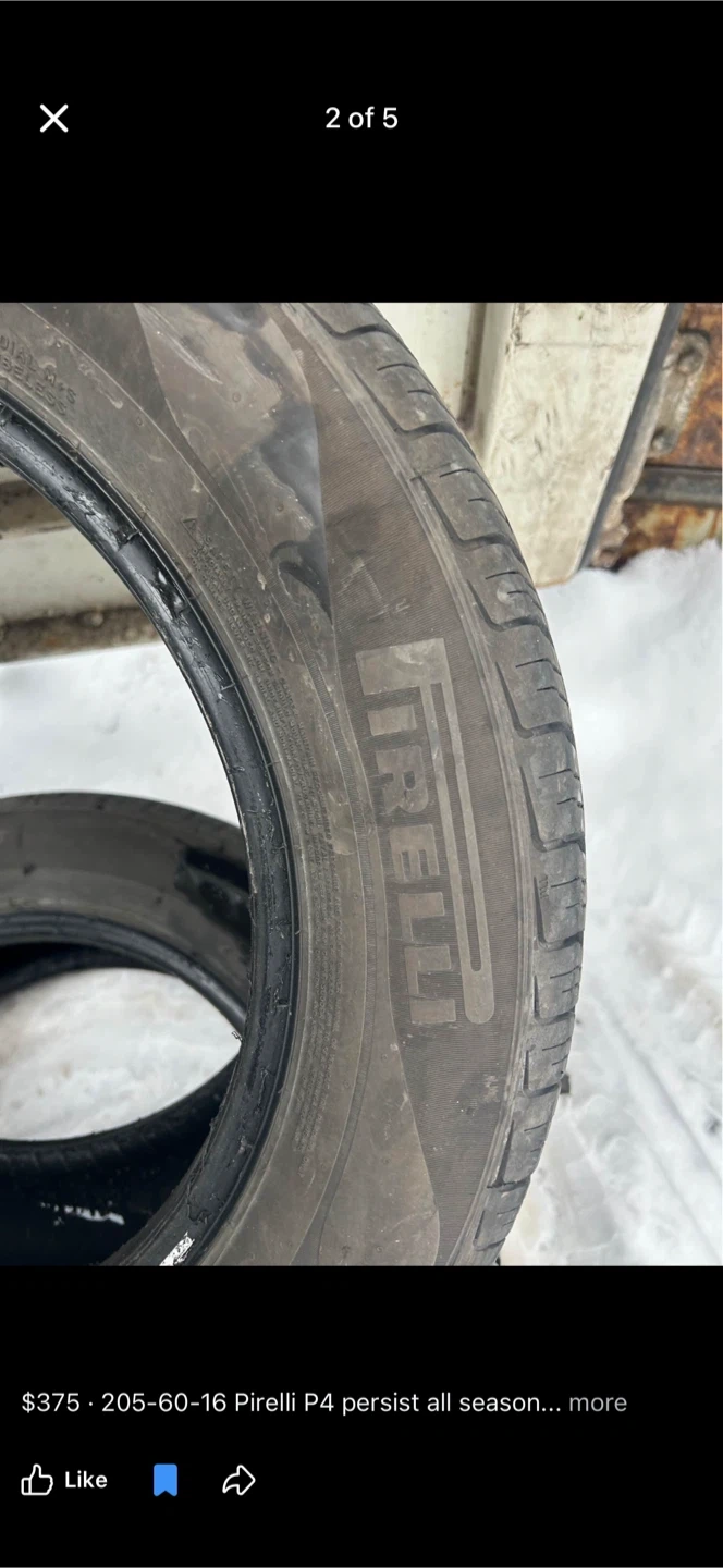 Buy & SellPirelli P4 Persist All Season Tire - 205-60-16Pirelli P4 Persist All Season Tire - 205-60-16$375This is a single Pirelli P4 Persist all-season tire. It's a size 205-60-16. This tire's tread provides good grip in various conditions.WHERE TO MEETSummerhill southView MapSELLERverifiedMariaNewmarket Clearmeadow700 reviews0 chats·0 favorites·4 viewsSEND CHAT TO SELLERHi Maria! I’m interested in your listing.Hi Maria! I’m interested in your listing.Get the Karrot app to chatSign In to chat