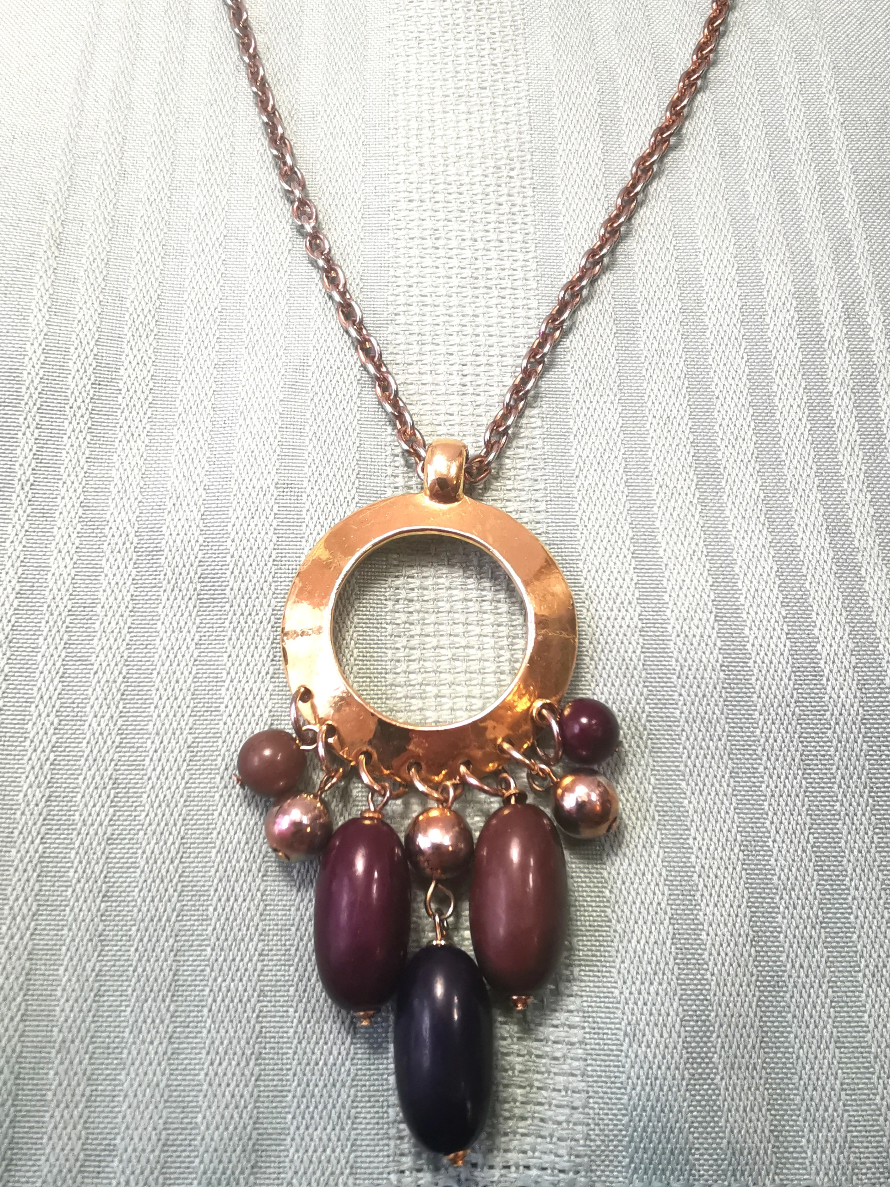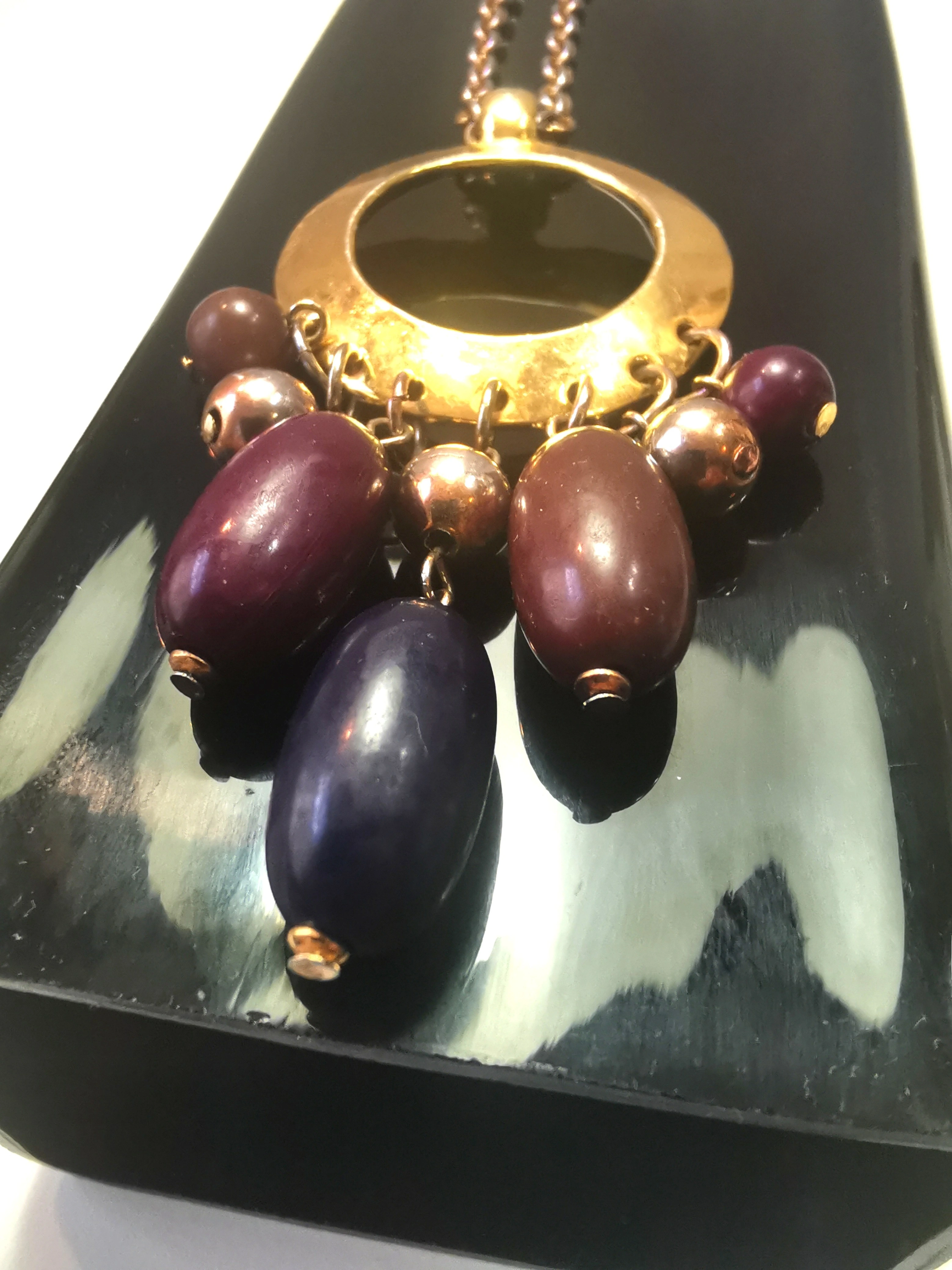 Design: Features a large, textured hammered-metal open circle holding a multi-strand tassel of colorful beads (amber, purple, and gold tones).