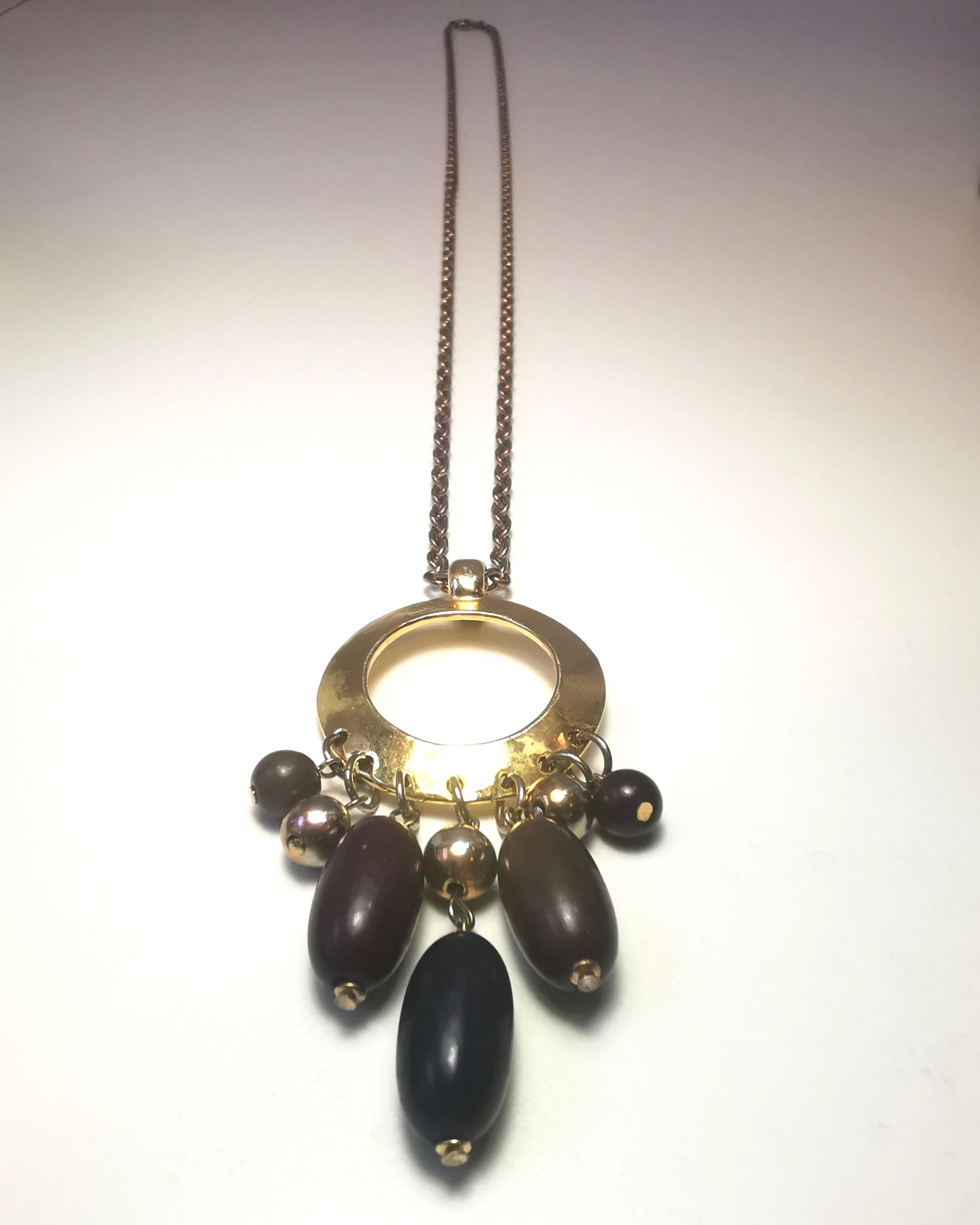 This is a substantial, runway-style piece from the early 1970s. The long chain and large pendant make it an ideal statement piece for layering or wearing over solid-colored fabrics.