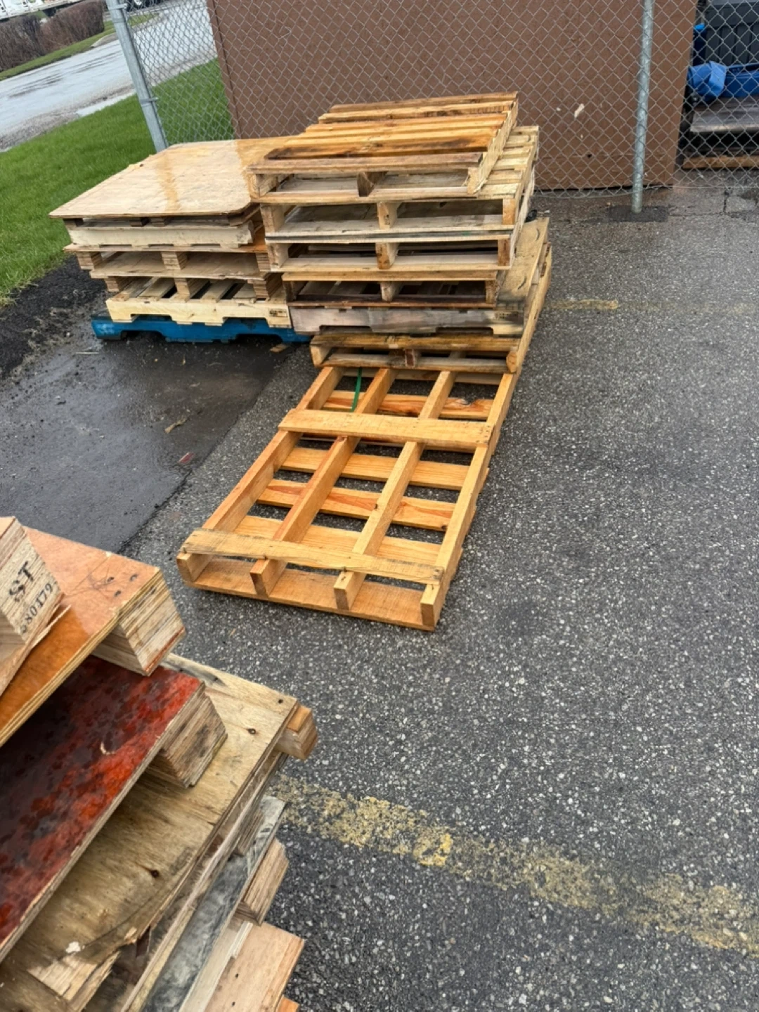 Stack of wooden pallets, some are heavier duty. Also includes a few large wooden crates, perfect for storage or shipping. Pallets are standard size. Crates are cube-shaped. Good for various uses!