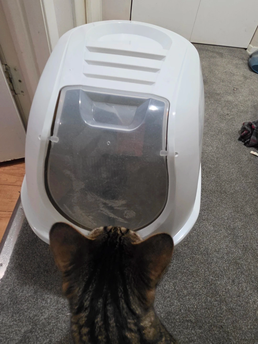 Enclosed hooded litter box in white. Features a clear swinging door and a grated top for ventilation and litter trapping. Helps contain odours and mess. Cat not included