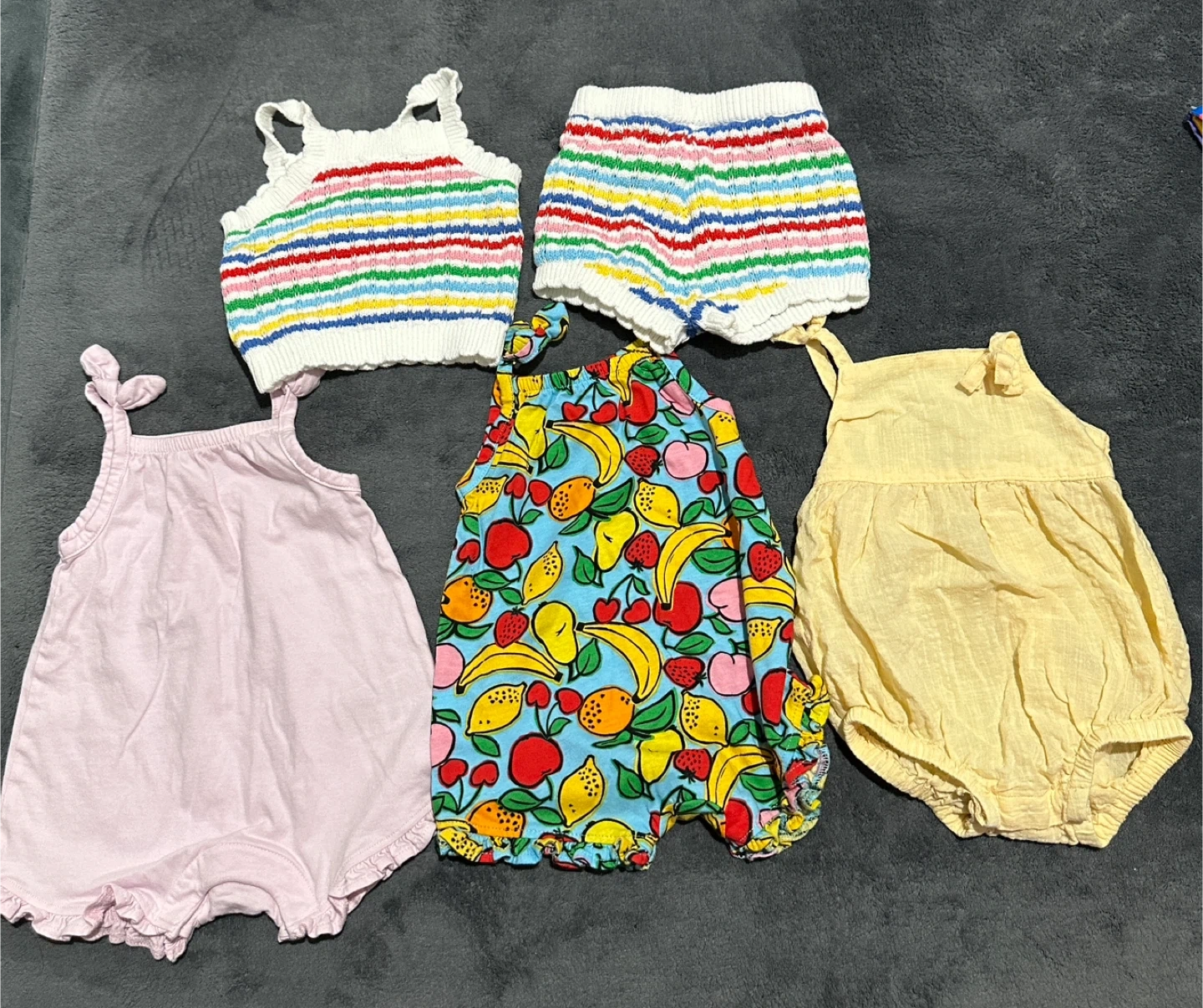 A cute bundle of baby clothes! This includes a variety of rompers in different colours and patterns, plus a matching top and shorts set. Perfect for your little one's summer wardrobe!