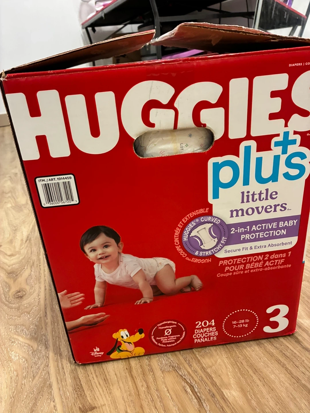 a box of Huggies Plus Little Movers diapers, size 3 (16-28 lb / 7-13 kg). These diapers offer 2-in-1 active baby protection with a secure fit and extra absorbent core. There are 204 diapers in the box. Perfect for your little one! would be open to swap for a size 4 diaper of any kind otherwise it’s free!:)