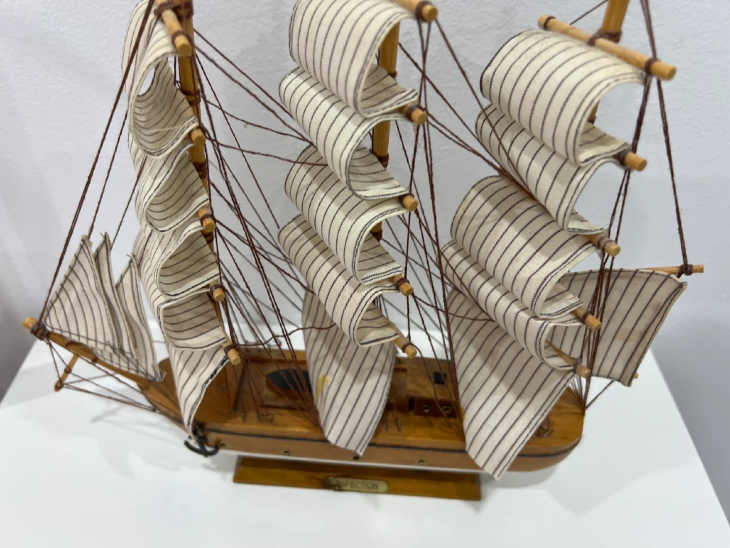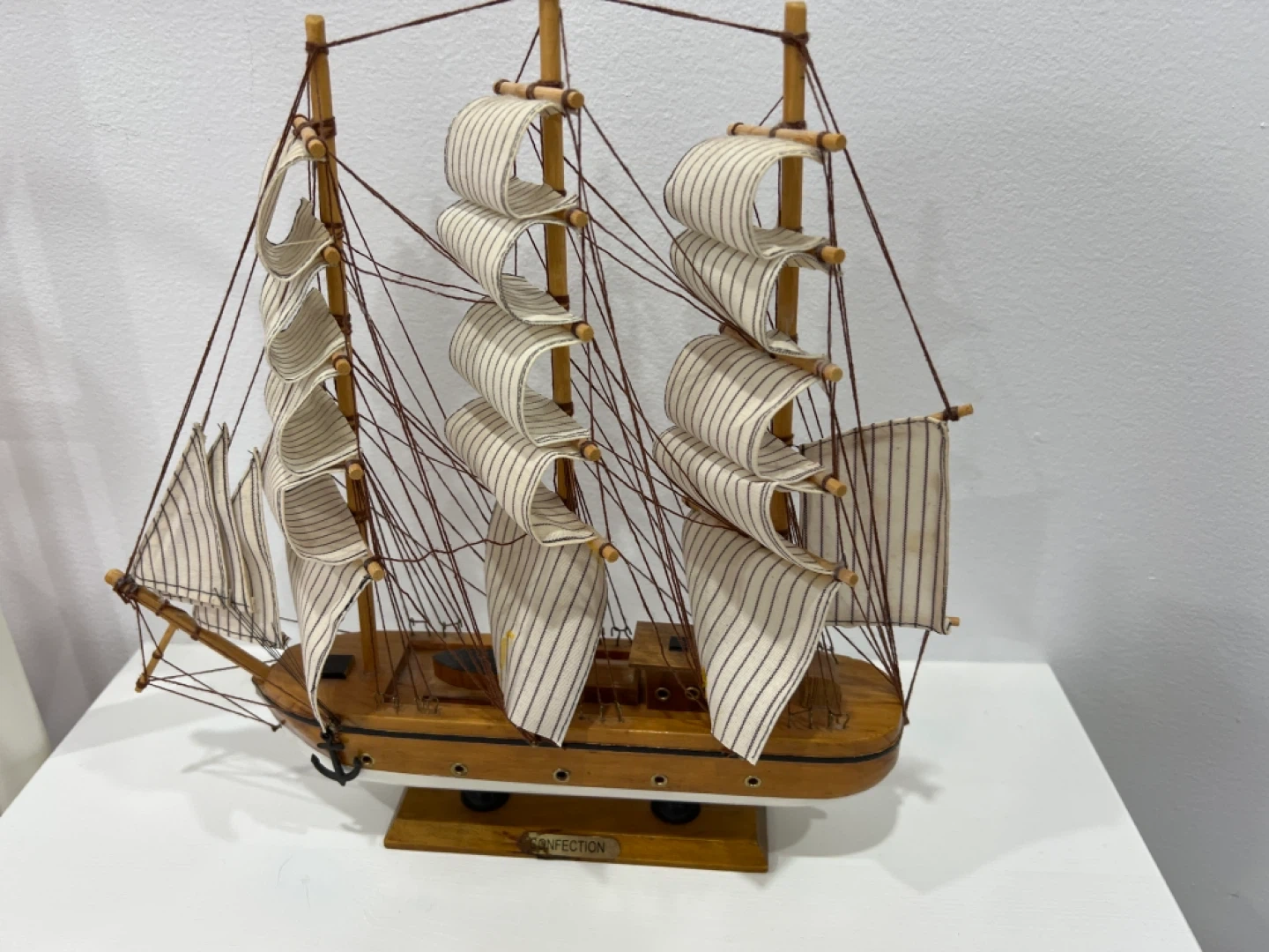Selling a charming Confection model sailboat! This decorative piece features striped sails and a wooden hull, perfect for adding a nautical touch to any room