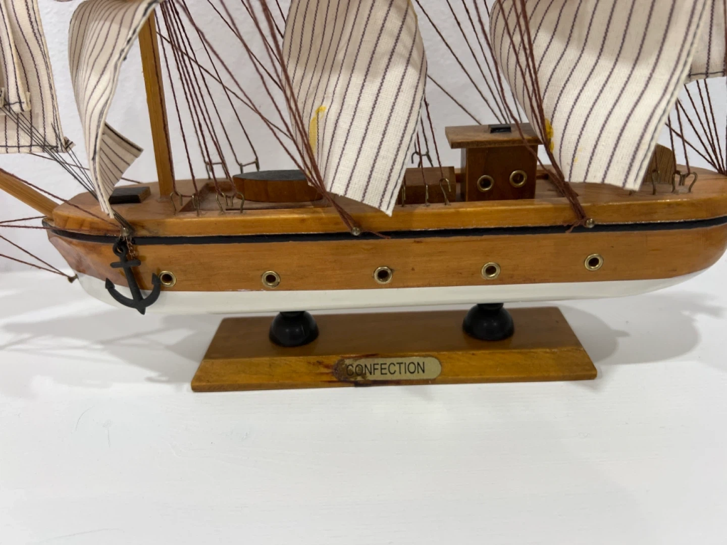 Selling a charming Confection model sailboat! This decorative piece features striped sails and a wooden hull, perfect for adding a nautical touch to any room