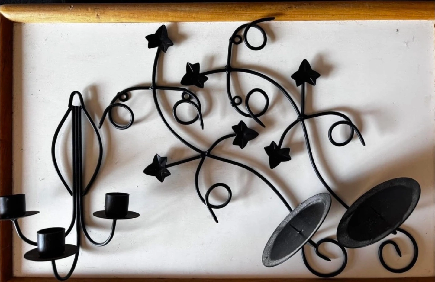Ornate black metal candle holder. Three candle holders on one piece and two individual candle holders. Wall mounted. Floral design.