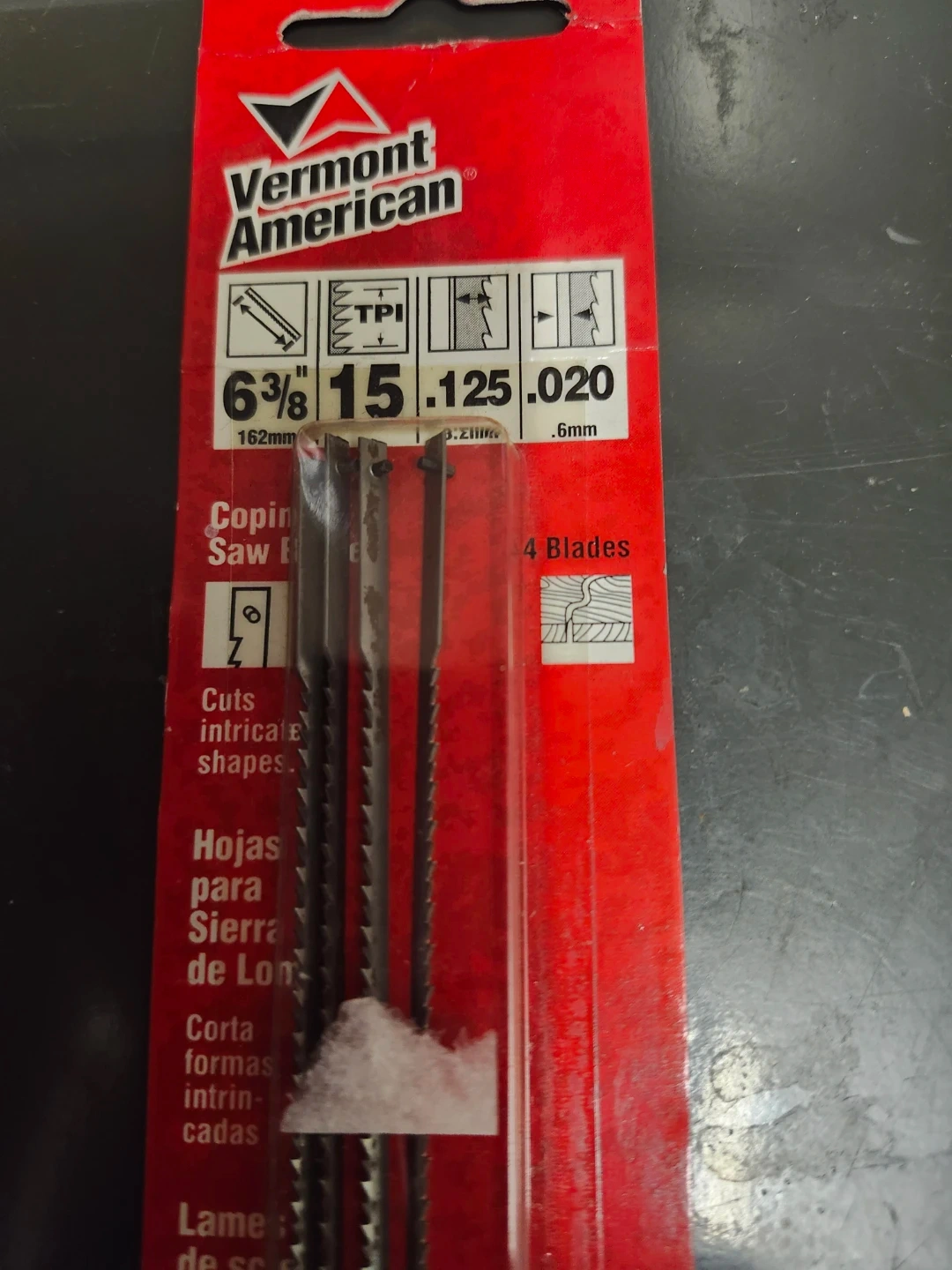 Selling a pack of Vermont American coping saw blades. This pack includes 4 blades, perfect for cutting intricate shapes. The blades are 6 3/8" (162mm) long. Great for your next project!