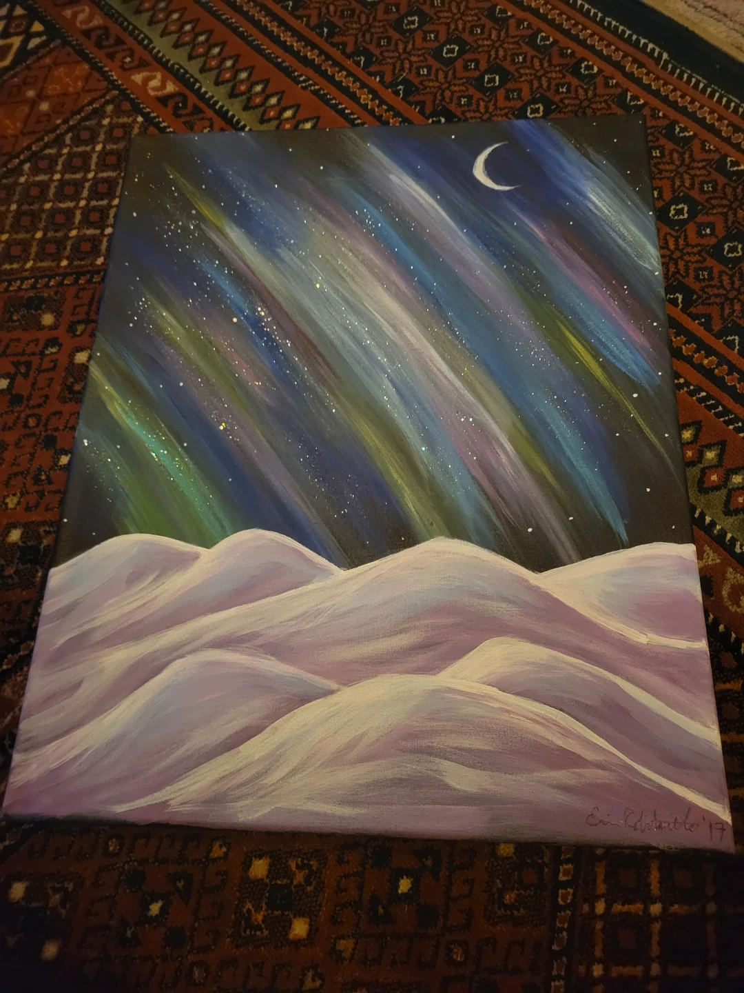This is an acrylic painting depicting the aurora borealis over snow-covered hills. This was a paint night piece I made in '17. Canvas material.