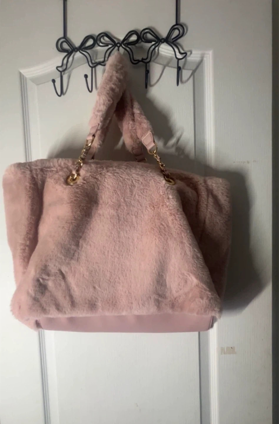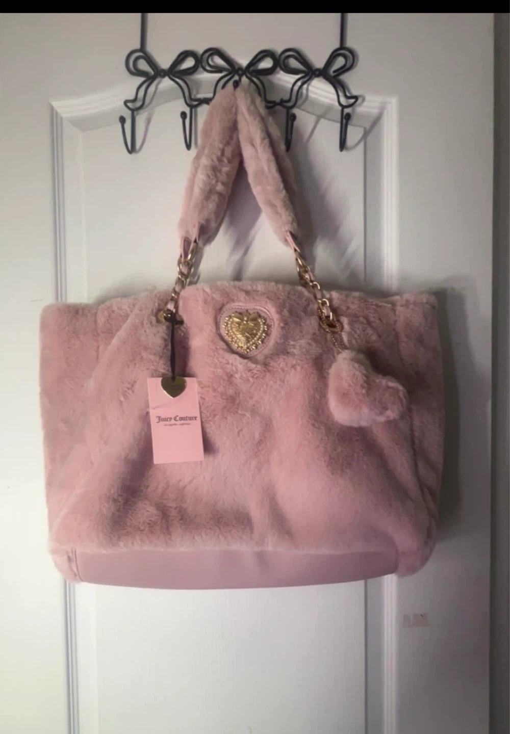 This is a new Juicy Couture Love Furry Friends tote bag. It's a dusty blush pink colour with gold chain details. The bag is made of soft faux fur.