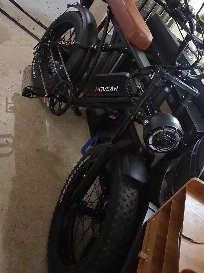 This is a HOVCAN fat tire electric bike. It features a robust frame with a brown seat and thick, knobby tires. The battery pack is integrated into the frame. It has a built-in headlight with a protective grille.