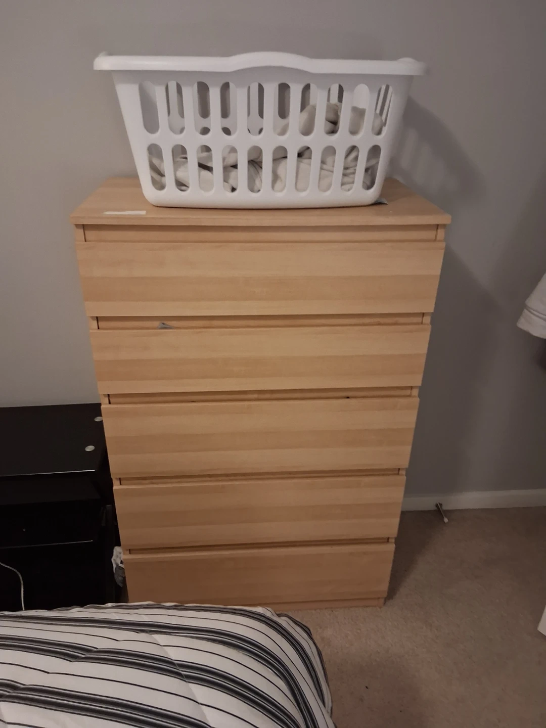 This is a light wood dresser with five drawers. It's a great piece for organizing clothes or linens. The simple design fits well in most bedrooms.