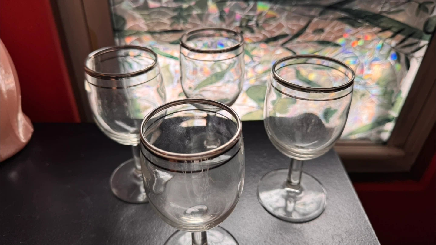 Buy & SellSet of 4 Small Wine Glasses with Silver RimSet of 4 Small Wine Glasses with Silver Rim$5Set of four small wine glasses. They feature a delicate silver band around the rim. Perfect for cordials or small pours!ConditionLike newWHERE TO MEETShorehavenView MapSELLERverifiedBrendaClason Point26921 reviews0 chats·0 favorites·3 viewsSEND CHAT TO SELLERHi Brenda! I’m interested in your listing.Hi Brenda! I’m interested in your listing.Get the Karrot app to chatSign In to chat