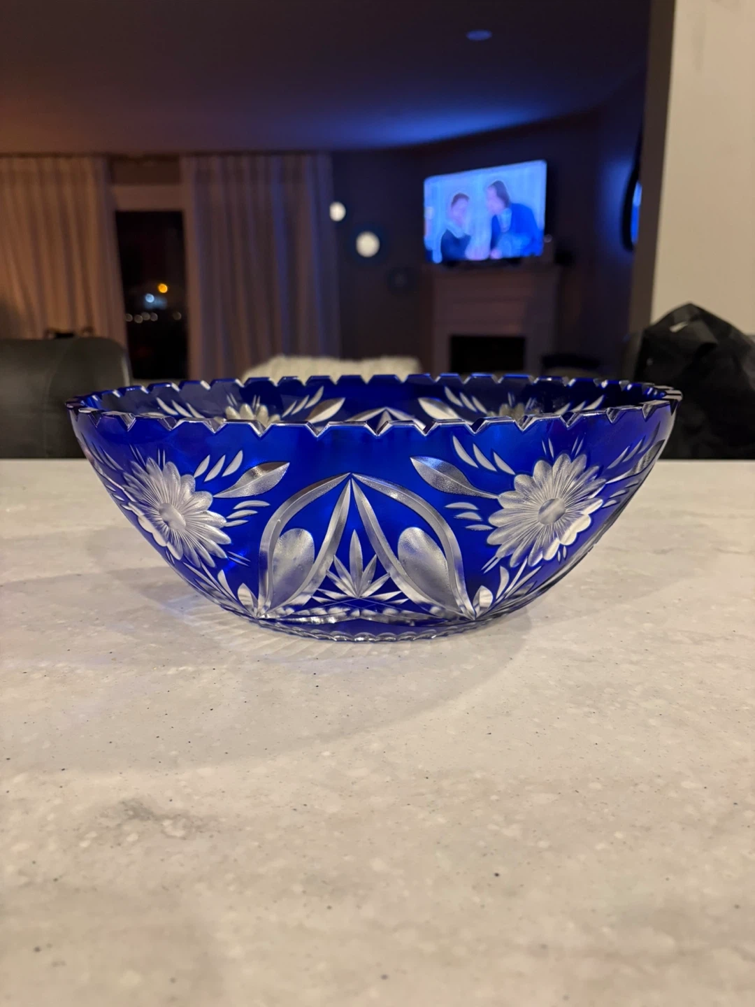 Stunning large vintage cobalt blue cut crystal bowl, measuring approximately 12 inches in diameter and 7 inches high. Features intricate hand-cut floral motifs, leaf patterns, and a star-cut base with a sawtooth rim.