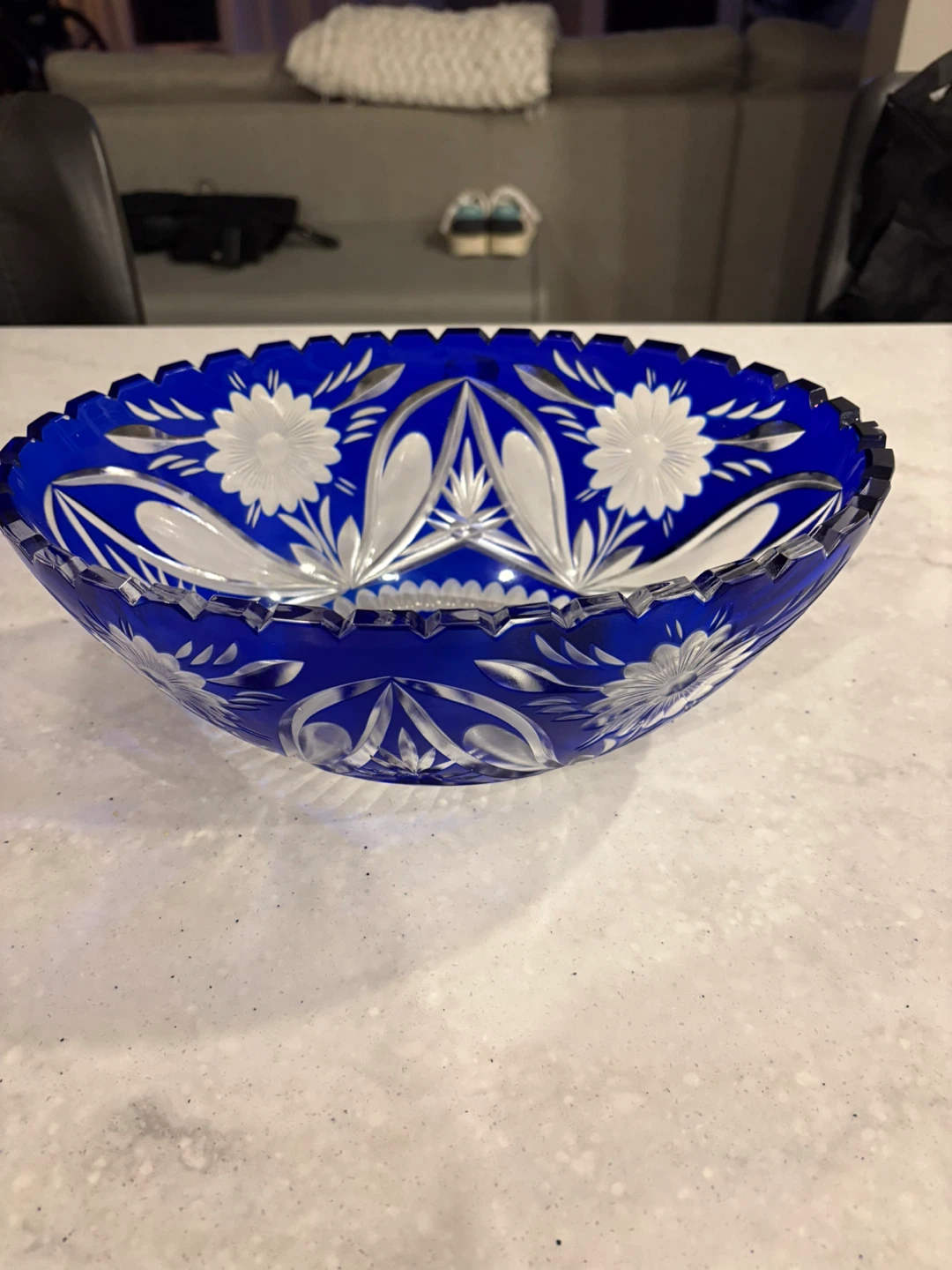 Stunning large vintage cobalt blue cut crystal bowl, measuring approximately 12 inches in diameter and 7 inches high. Features intricate hand-cut floral motifs, leaf patterns, and a star-cut base with a sawtooth rim.
