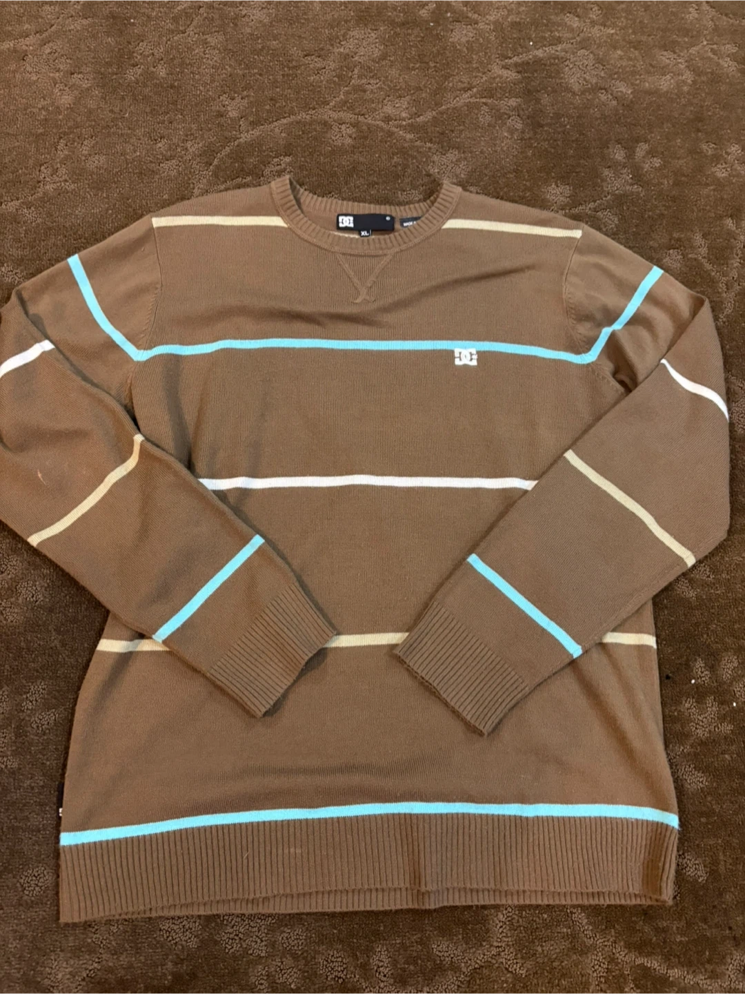 Selling a DC crew neck sweater in brown with light blue, white, and beige stripes. It's a size XL and in great condition. Perfect for adding a bit of style to your wardrobe!