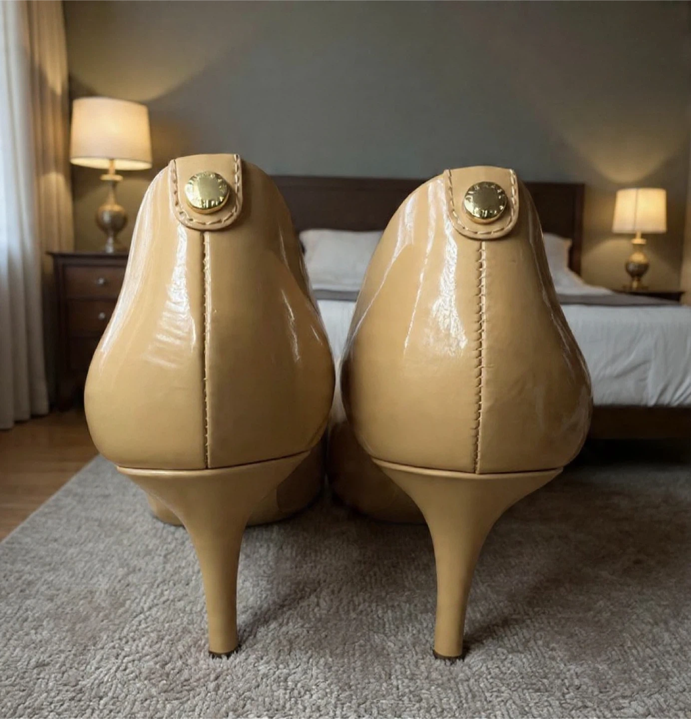 These Michael Kors pumps are a classic tan patent leather. They're a stylish choice for any occasion. Leather upper and lining.