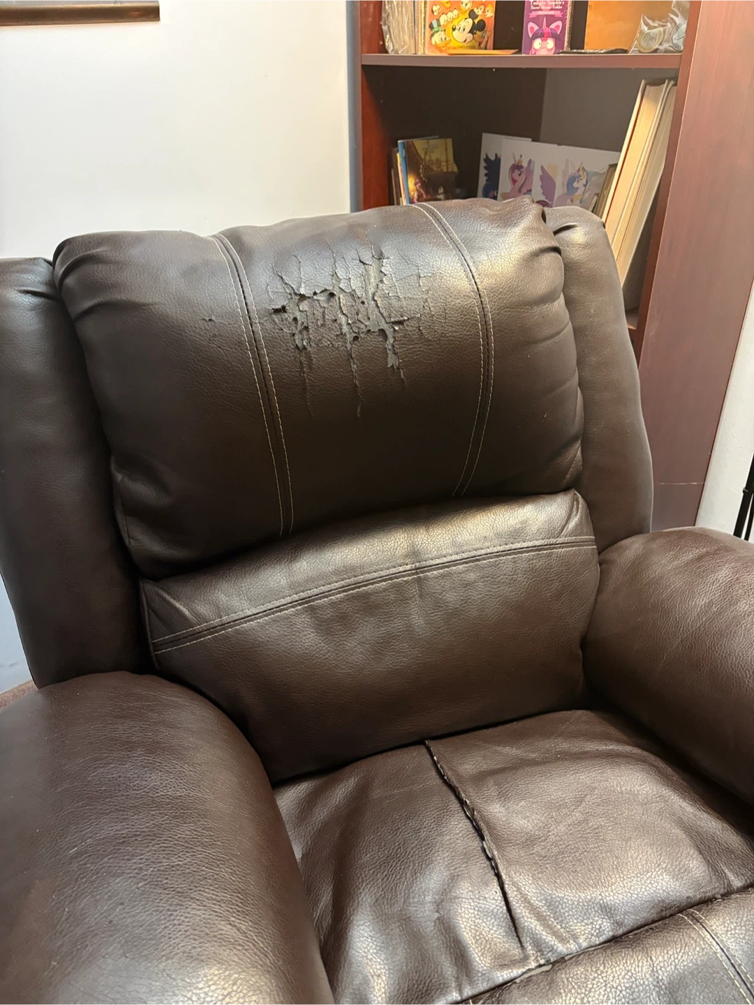 Comfortable brown recliner chair. Made of faux leather material. Shows some wear and tear on the headrest and seat cushion.