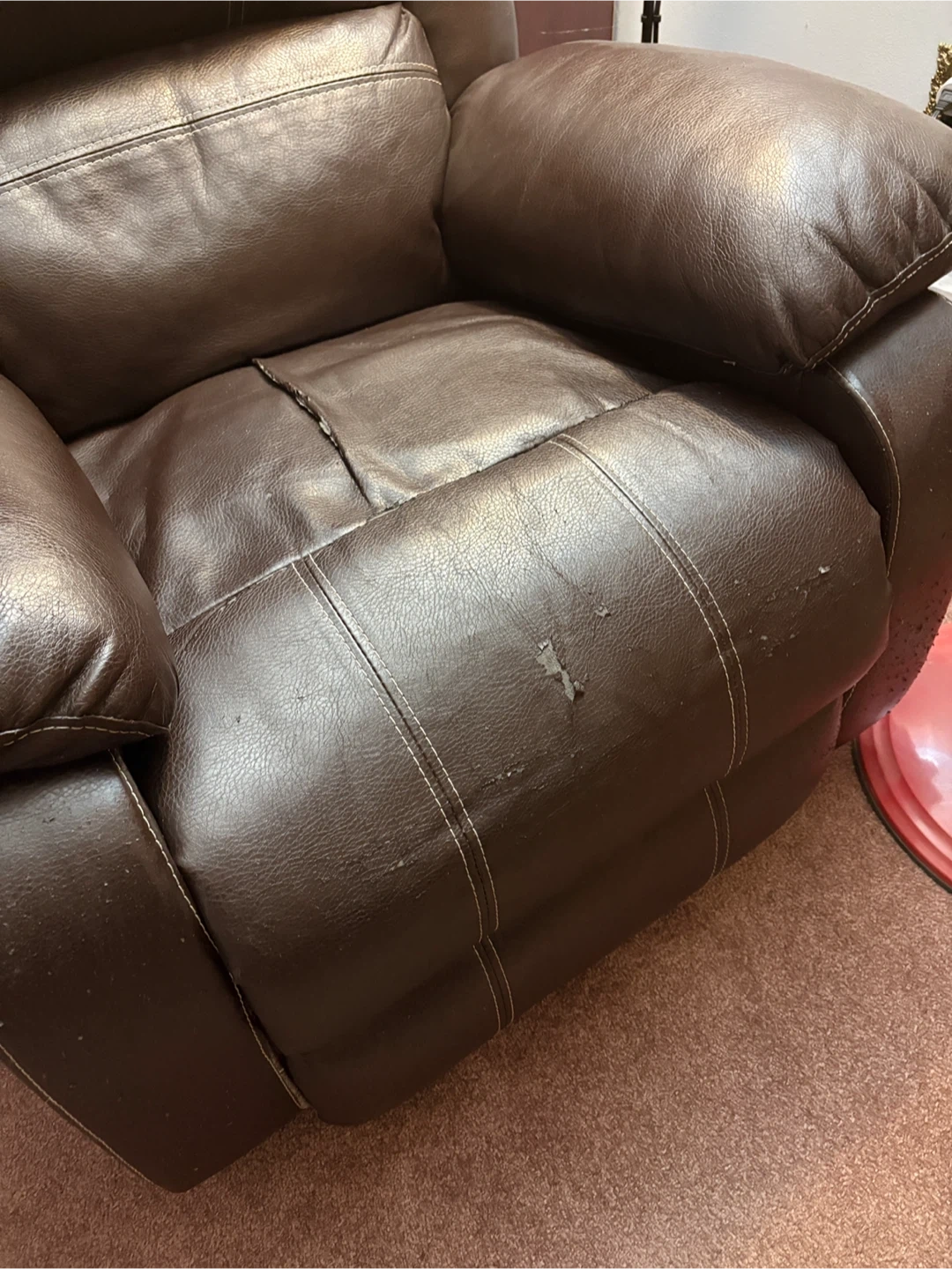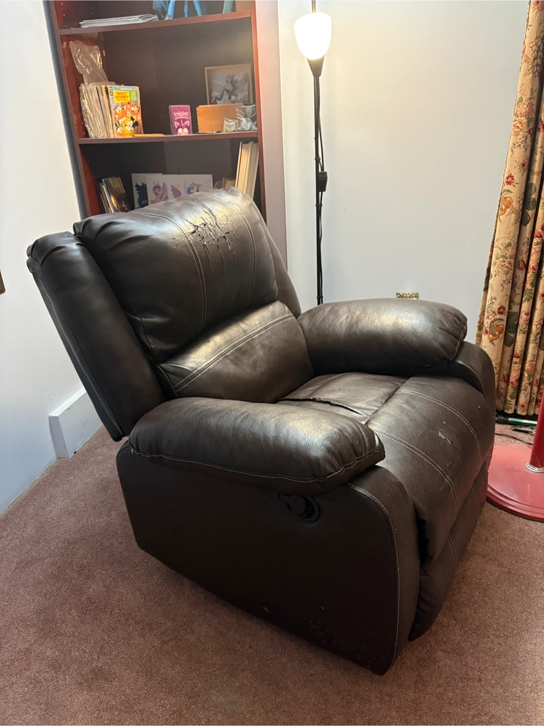 Comfortable brown recliner chair. Made of faux leather material. Shows some wear and tear on the headrest and seat cushion.
