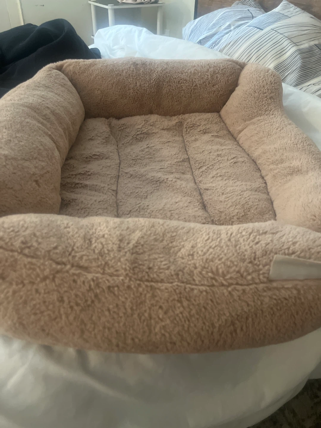 Plush dog bed from Queenwest Trading Co. Made with 100% polyester fill and lining. It's a comfortable spot for your furry friend!