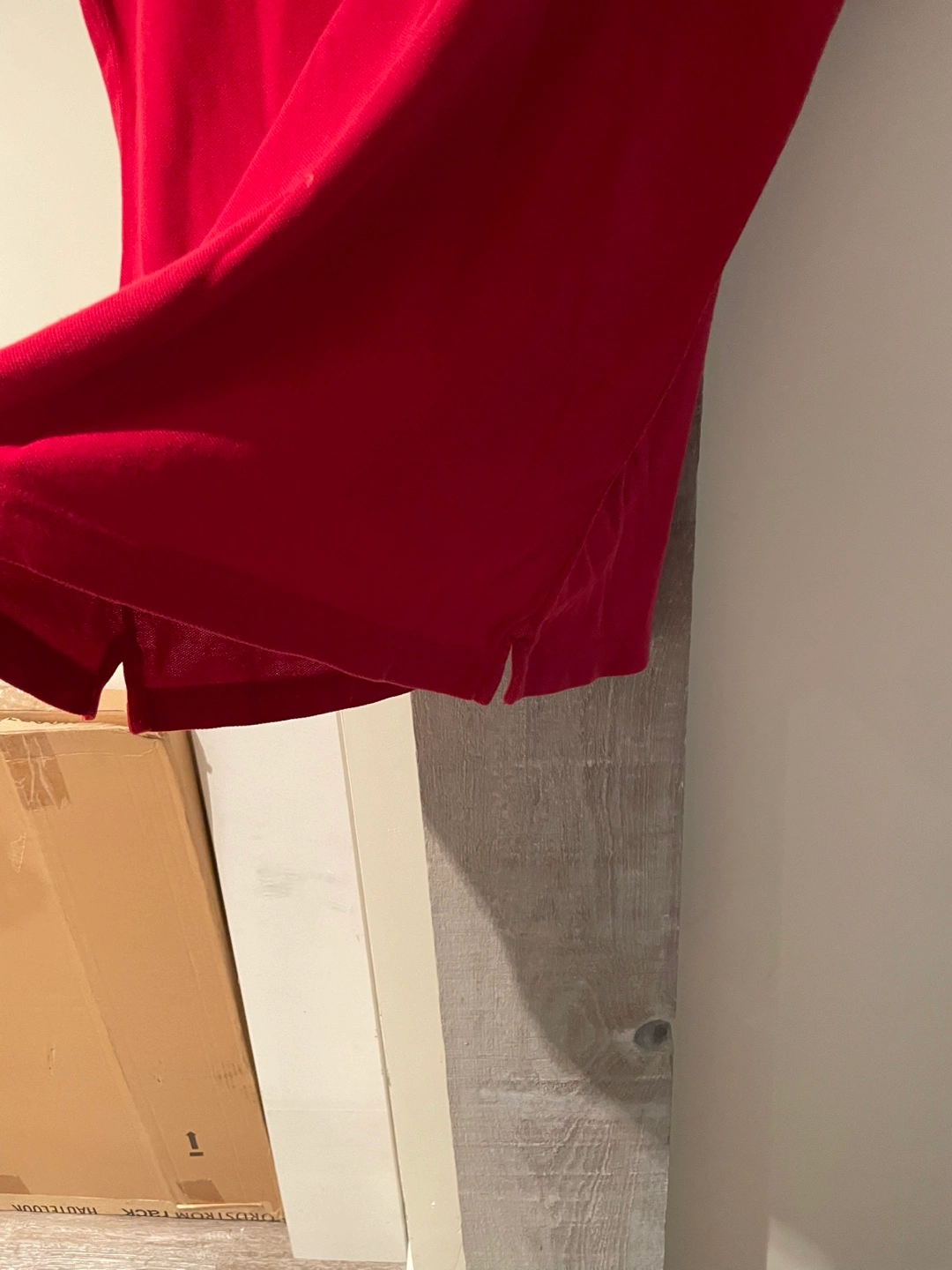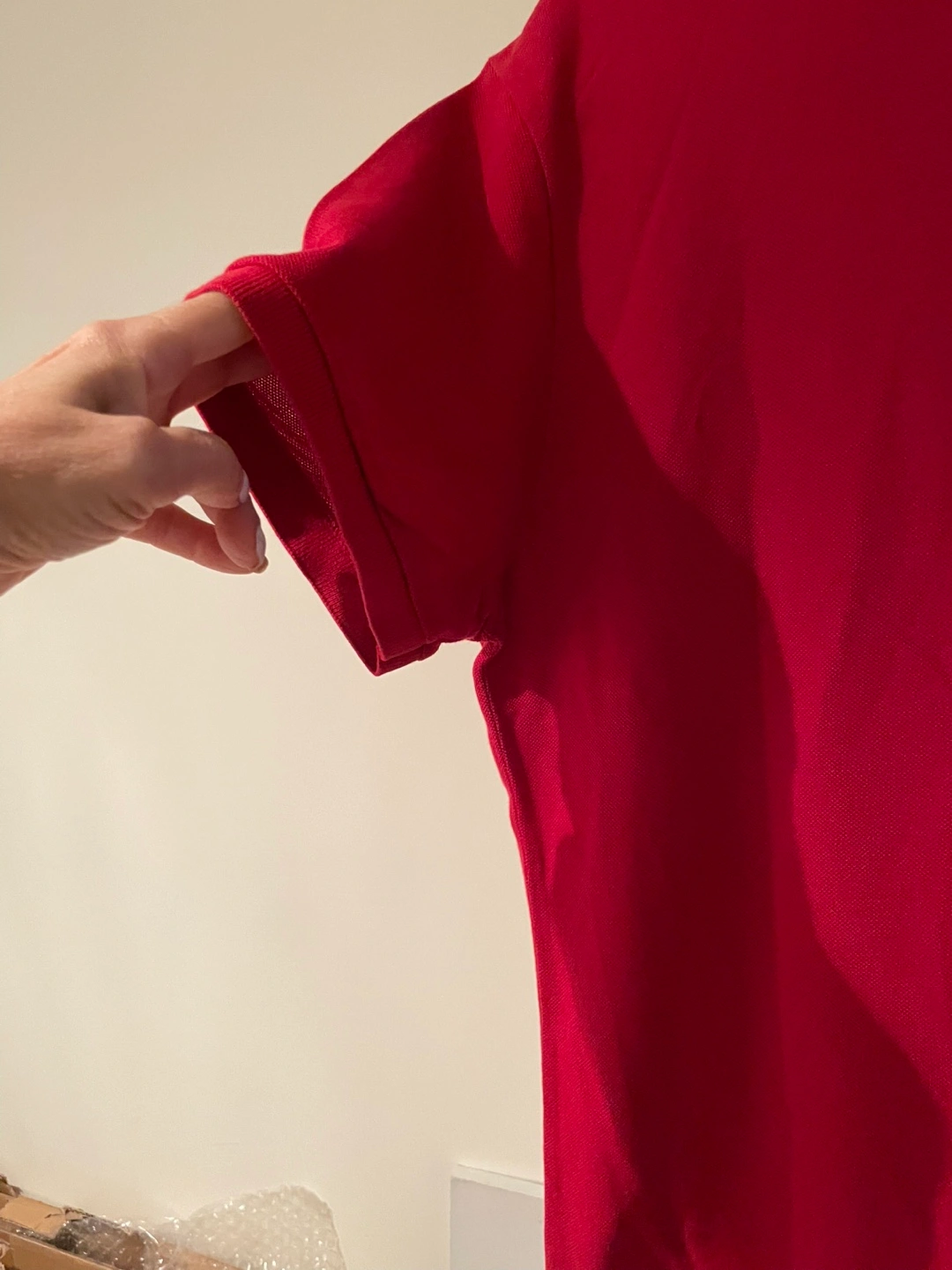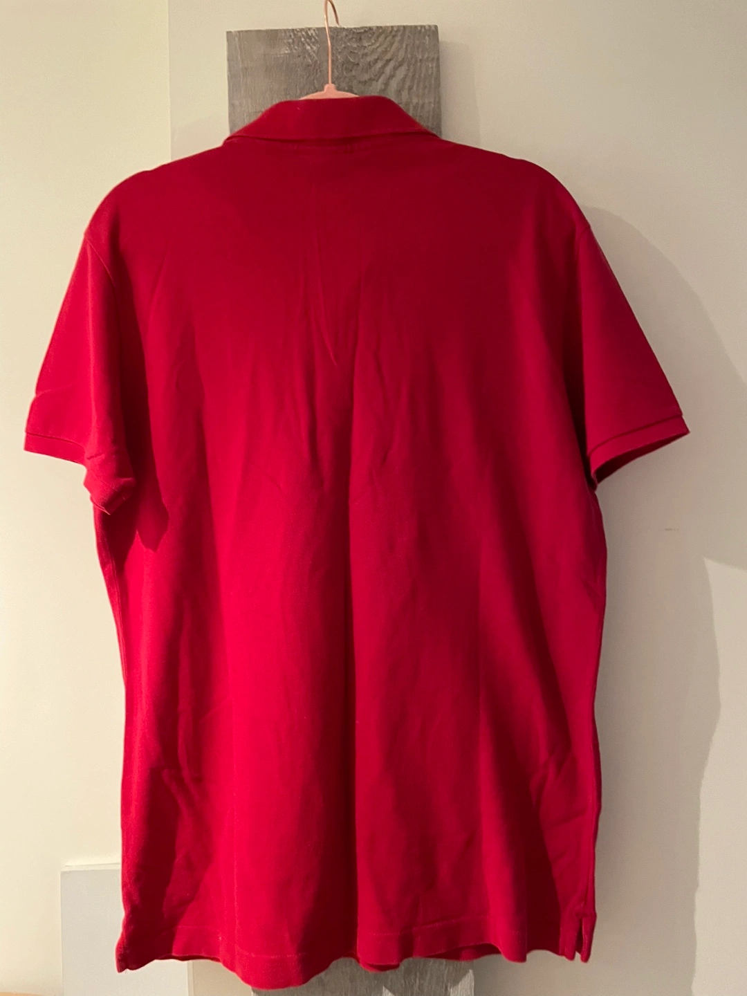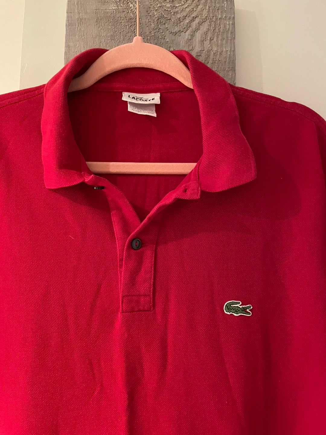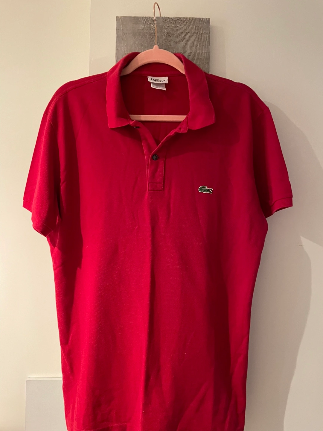Here's a classic Lacoste polo shirt in a vibrant red! It's in great shape and ready for a new home. Perfect for a casual day out or dressing up a bit