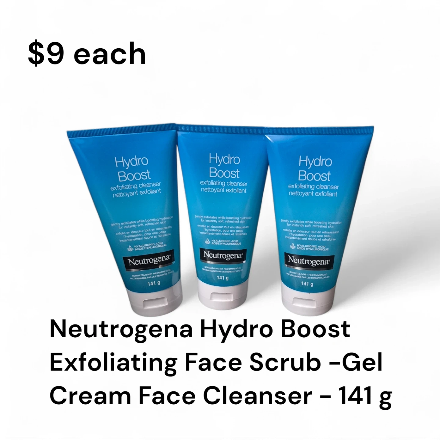 Three Neutrogena Hydro Boost exfoliating cleansers. Each contains hyaluronic acid for boosted hydration. Gently exfoliates for instantly soft, refreshed skin. 141g per tube.