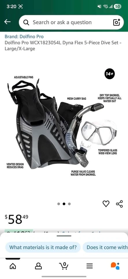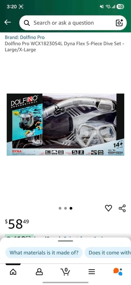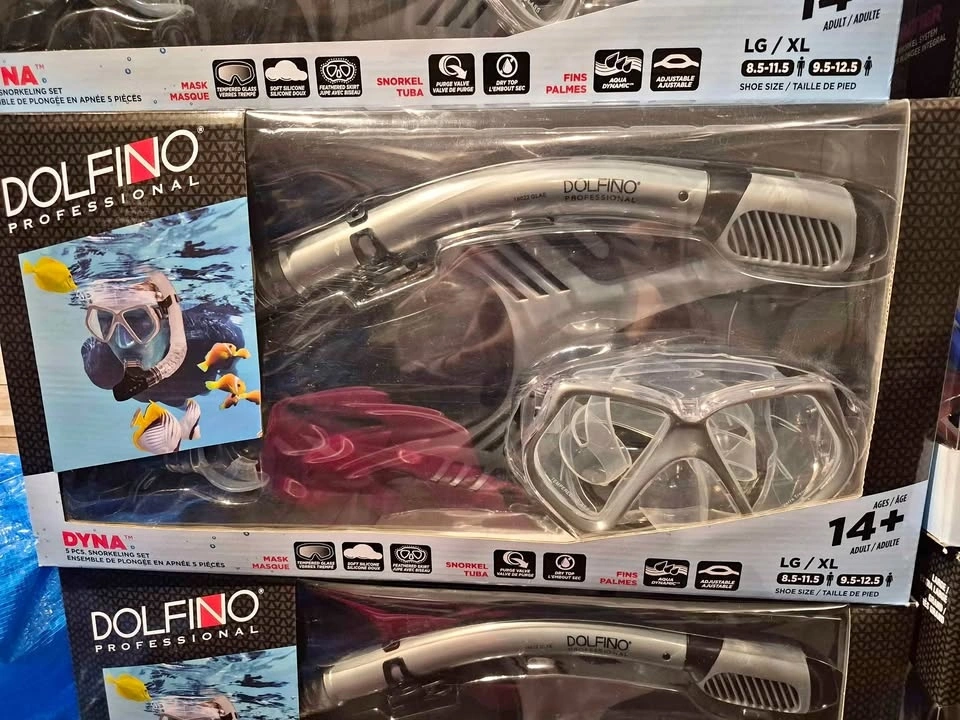 Brand new Dolfino 5-piece snorkeling set. I have 4 available for $30 each. Fits large/XL sizes, suitable for ages 14+ to adult. Shoe size 8.5-11.5 Men or 9.5-12.5 Women.
