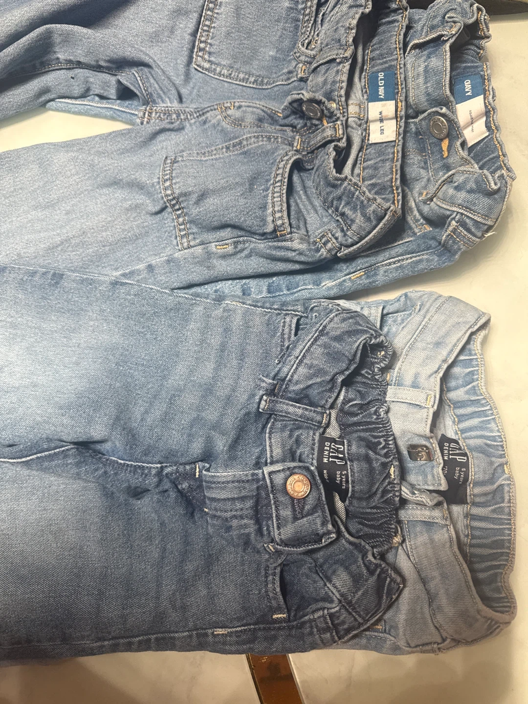 Two pairs of kids' jeans from Old Navy and Gap. Both are size 5 and made of denim. They feature elastic waistbands for comfort.