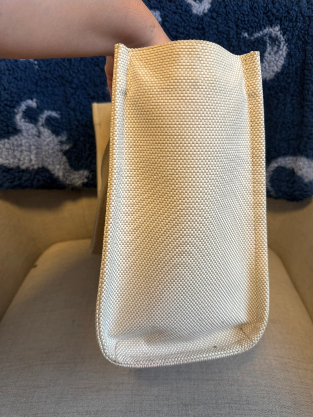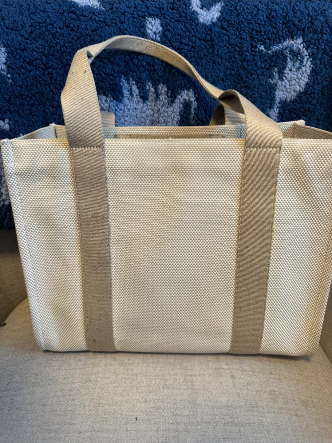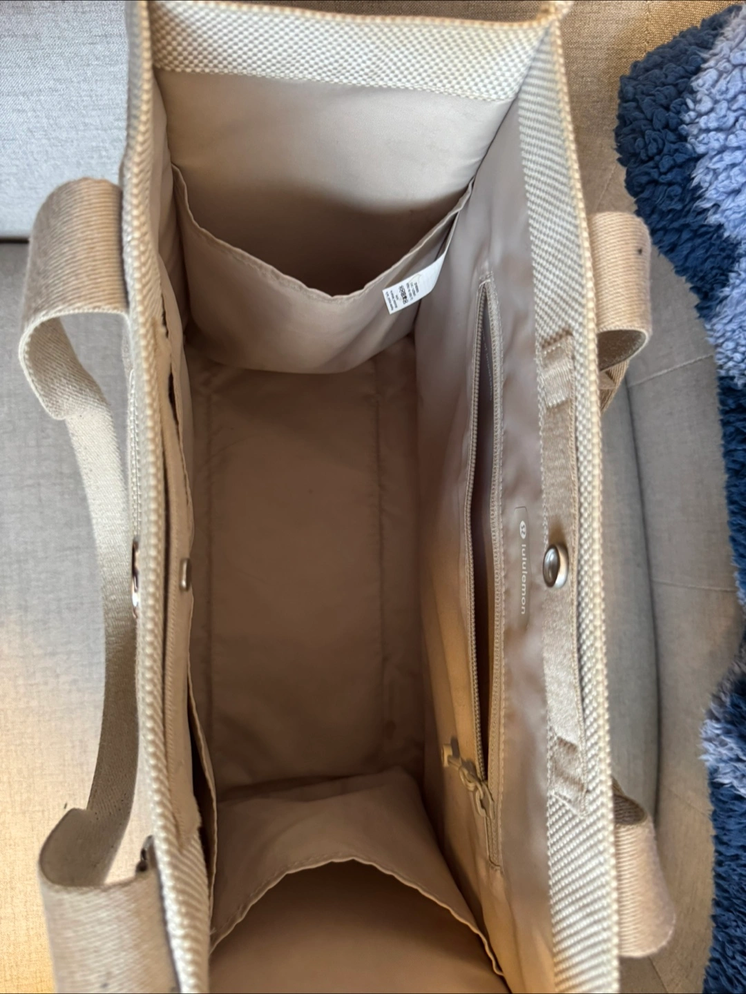 Selling a Lululemon tote bag in a lovely ivory and beige colour. It's in good condition and ready for a new home! Perfect for carrying your essentials. The price reflects the condition. Has a slot for water bottle!