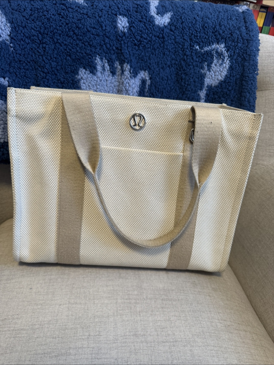 Selling a Lululemon tote bag in a lovely ivory and beige colour. It's in good condition and ready for a new home! Perfect for carrying your essentials. The price reflects the condition. Has a slot for water bottle!