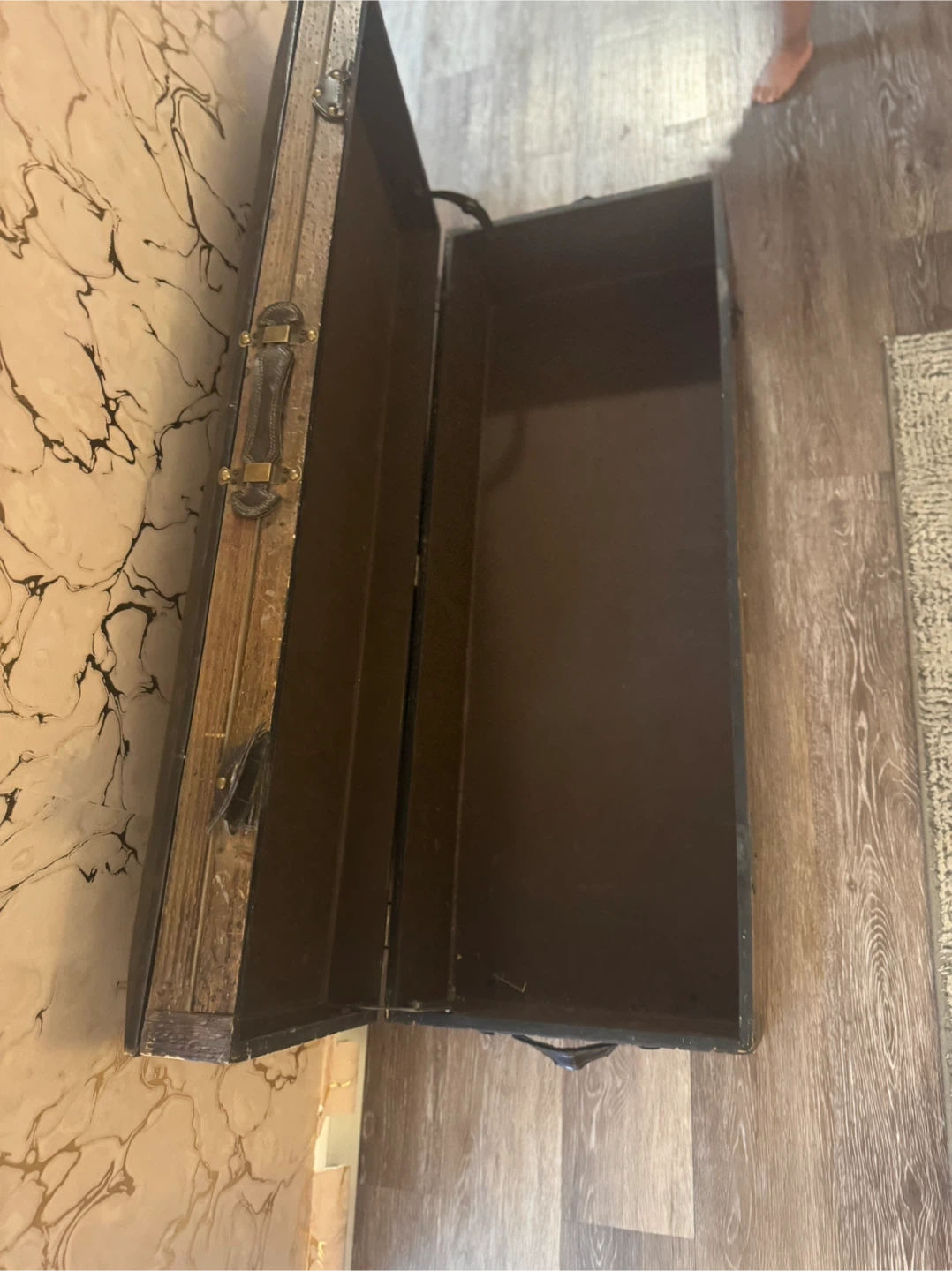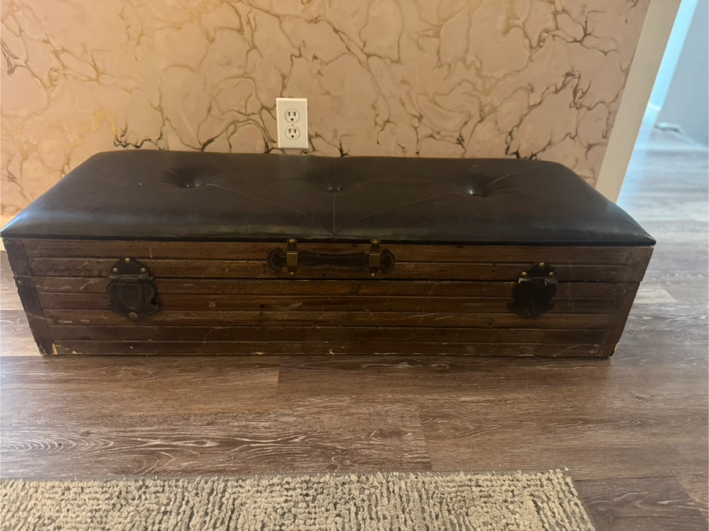 This decorative trunk offers ample storage space and can also serve as an ottoman. Its rustic wood and tufted leatherette top adds a unique touch to any room. Great for storing blankets or other household items!