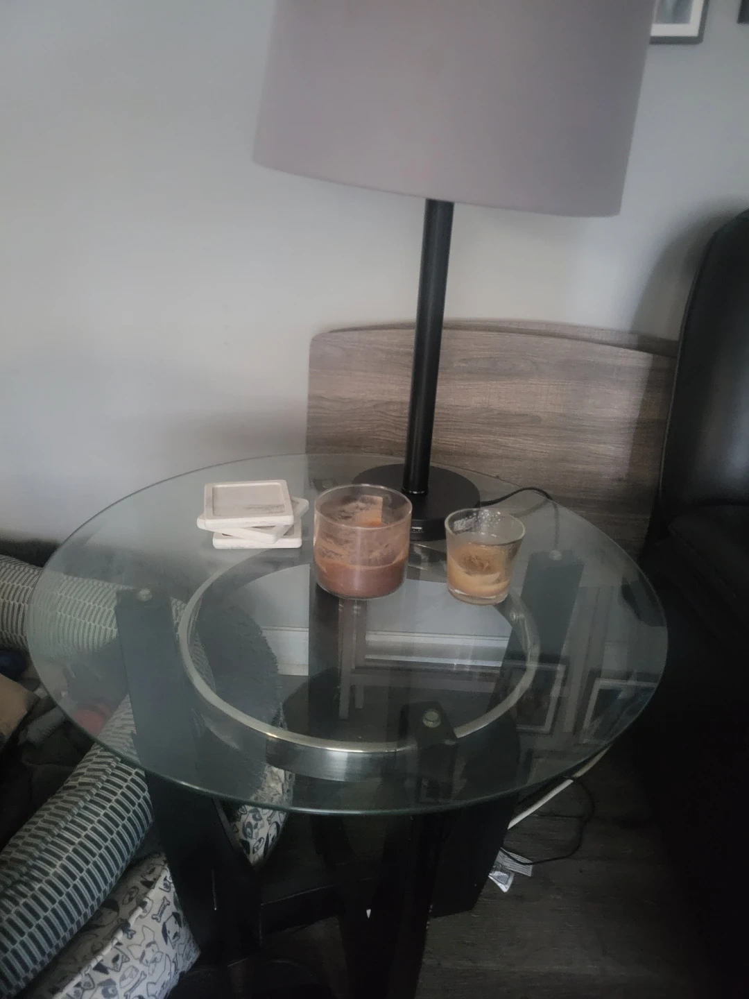 This round side table features a clear glass top with a metal accent ring. It has a dark wood base with an interesting geometric design. It's perfect and includes lamps, books, or drinks next to a sofa or chair.